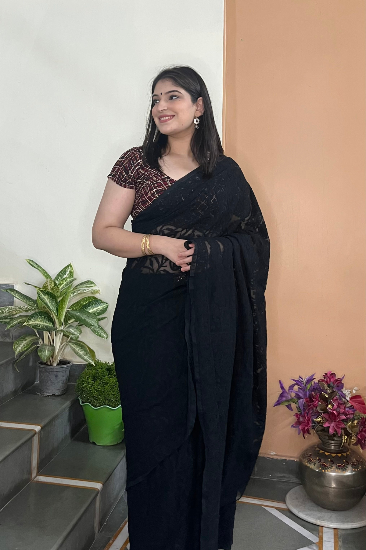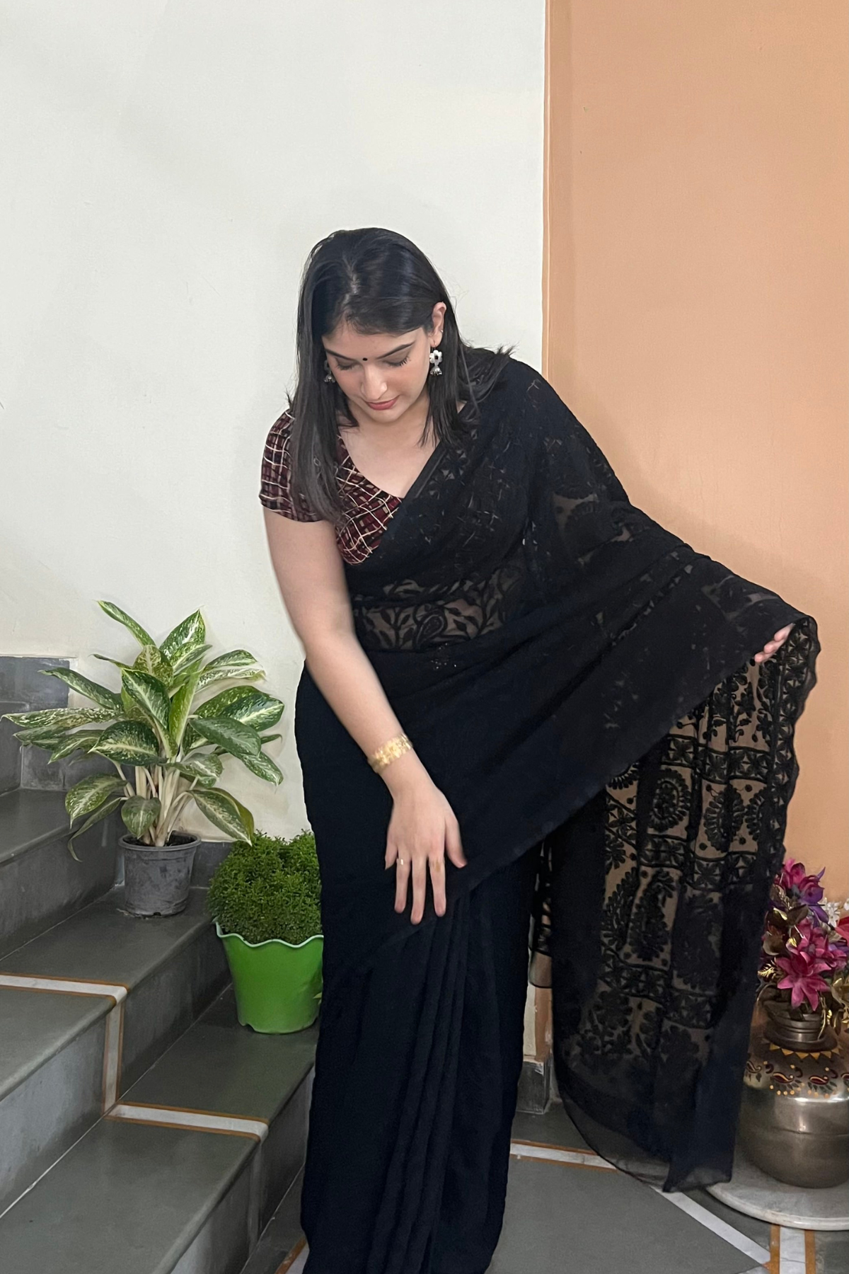 A beautiful hand embroidered Chikankari Saree having all over hand embroidered Chikankari embroidery on it. The saree comes in Zed black colour with same black coloured thread embroidery on it. Has heavy designer palla and straight jaal all over it.