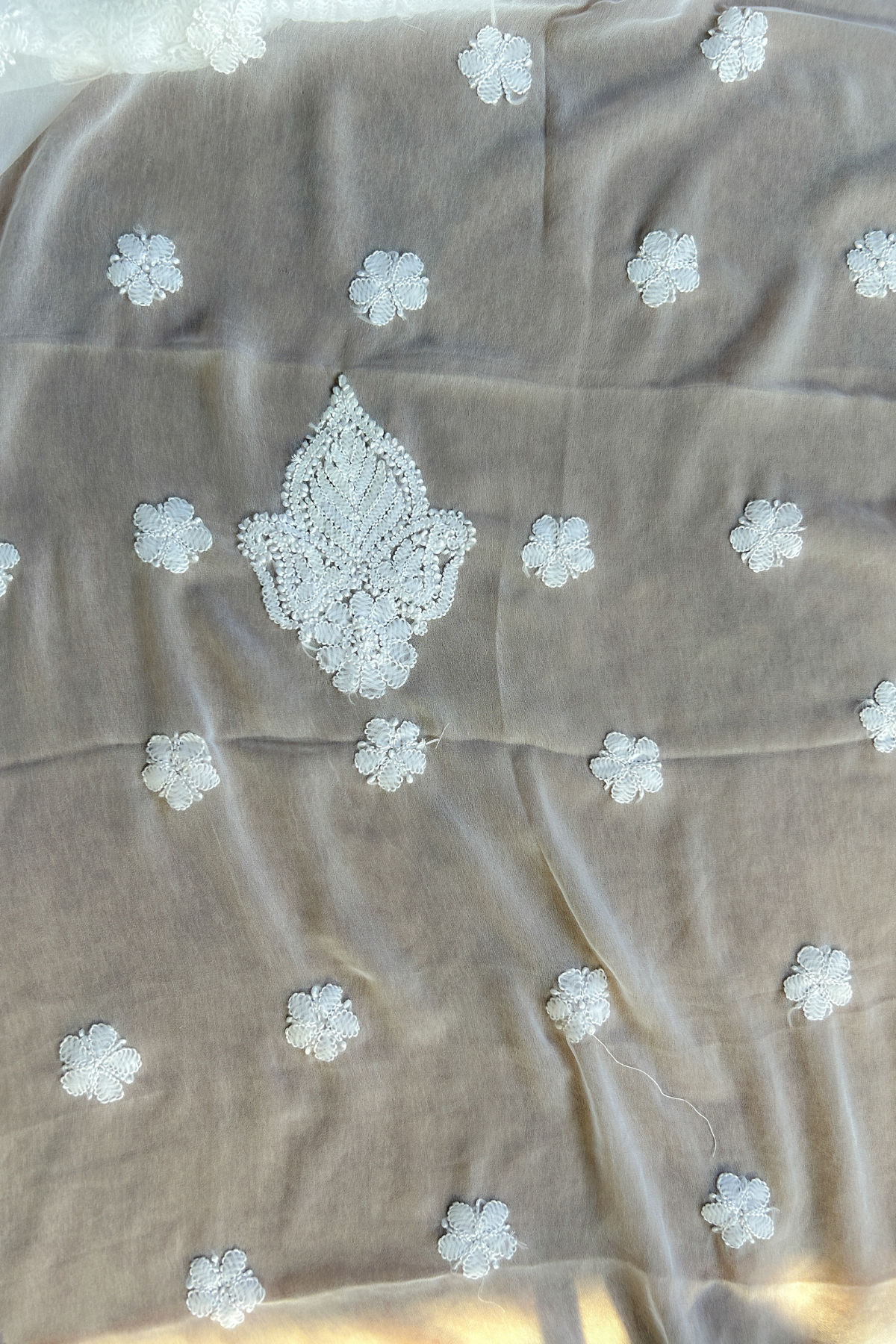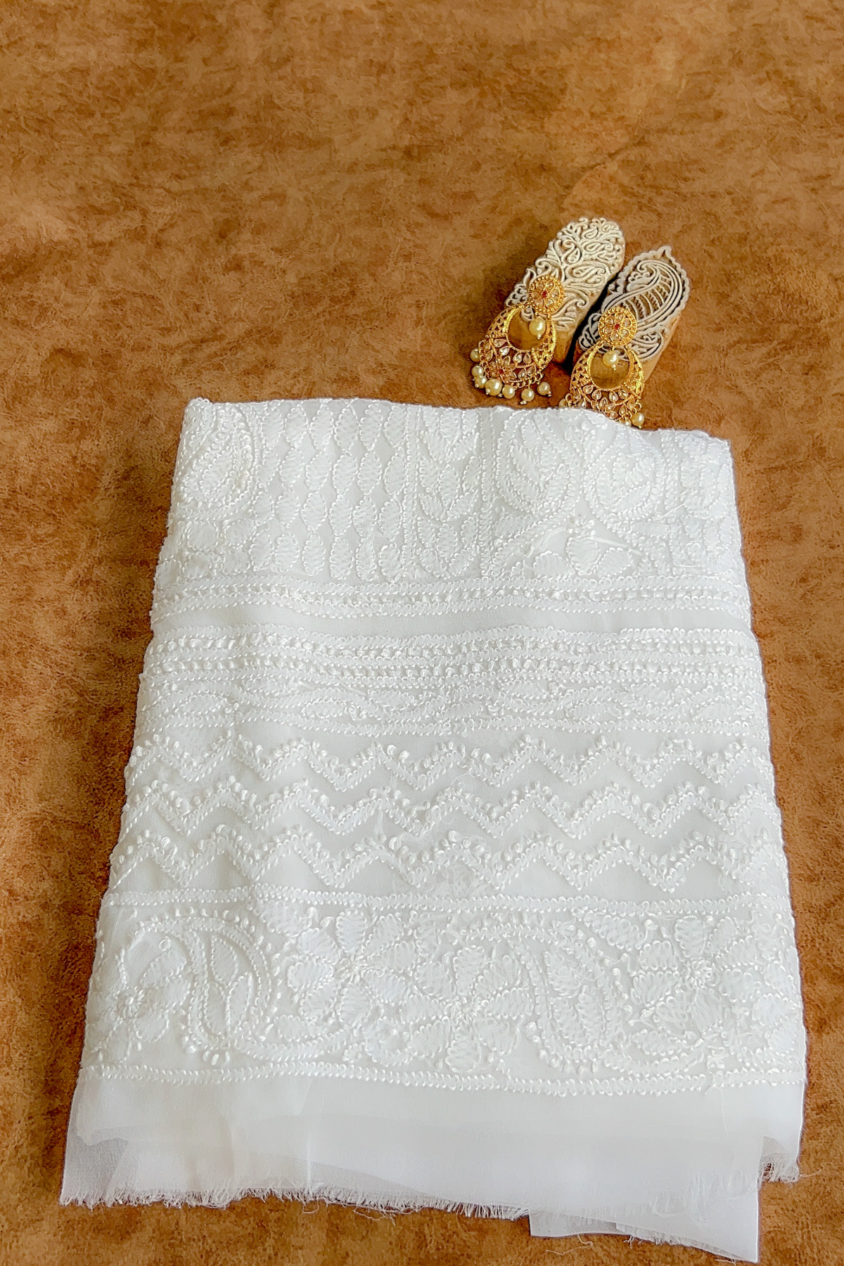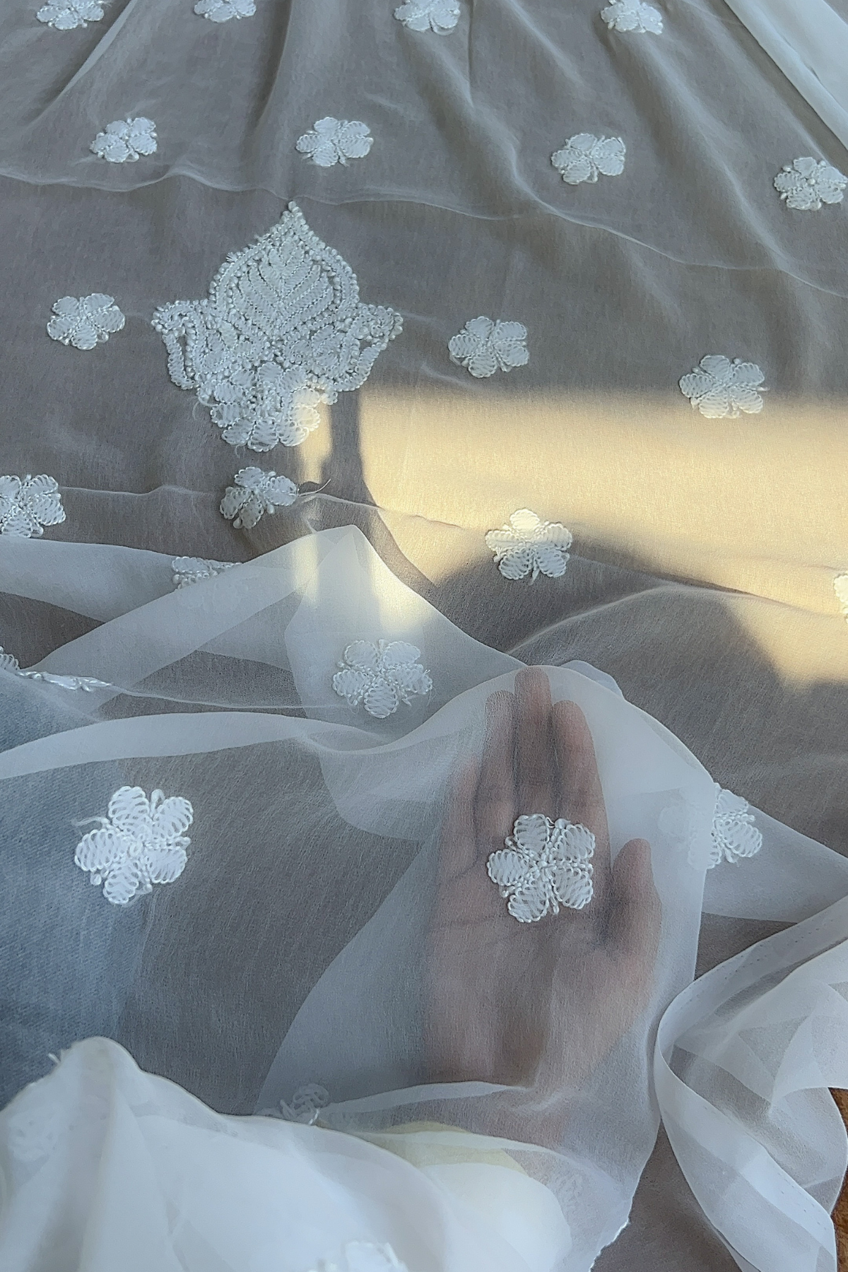 This exquisite unstitched Chikankari Kurti piece features intricate hand embroidery on semi-georgette fabric. The full front showcases a detailed jaal pattern crafted with bakhiya and phanda stitches, complemented by a richly embroidered daaman. The elegant white-on-white embroidery adds subtle sophistication to this timeless design.