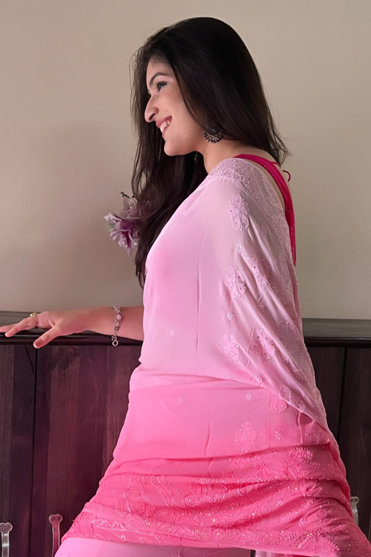 Pure resham thread. The saree is ombre dyed in pink color and can be further dyed. It also has golden muqaish embellishments on it.