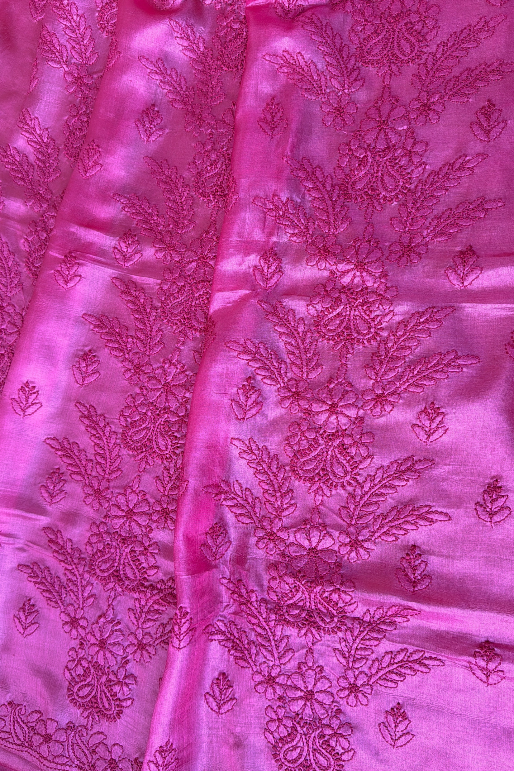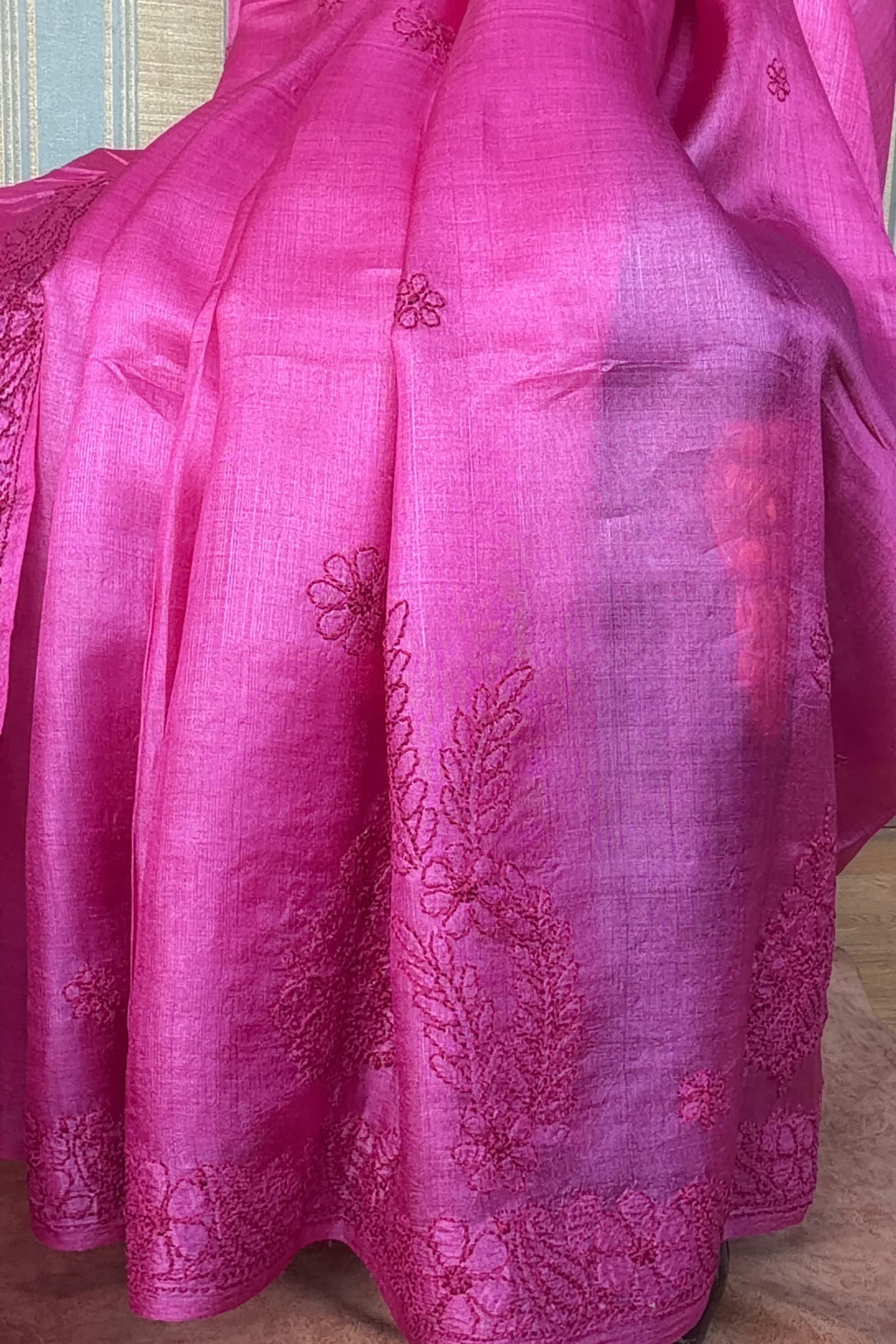 The vibrant pink hue enhances the finesse of traditional Lucknowi Chikankari, making this saree an exquisite choice for festive celebrations, weddings, and special occasions where timeless elegance is desired.