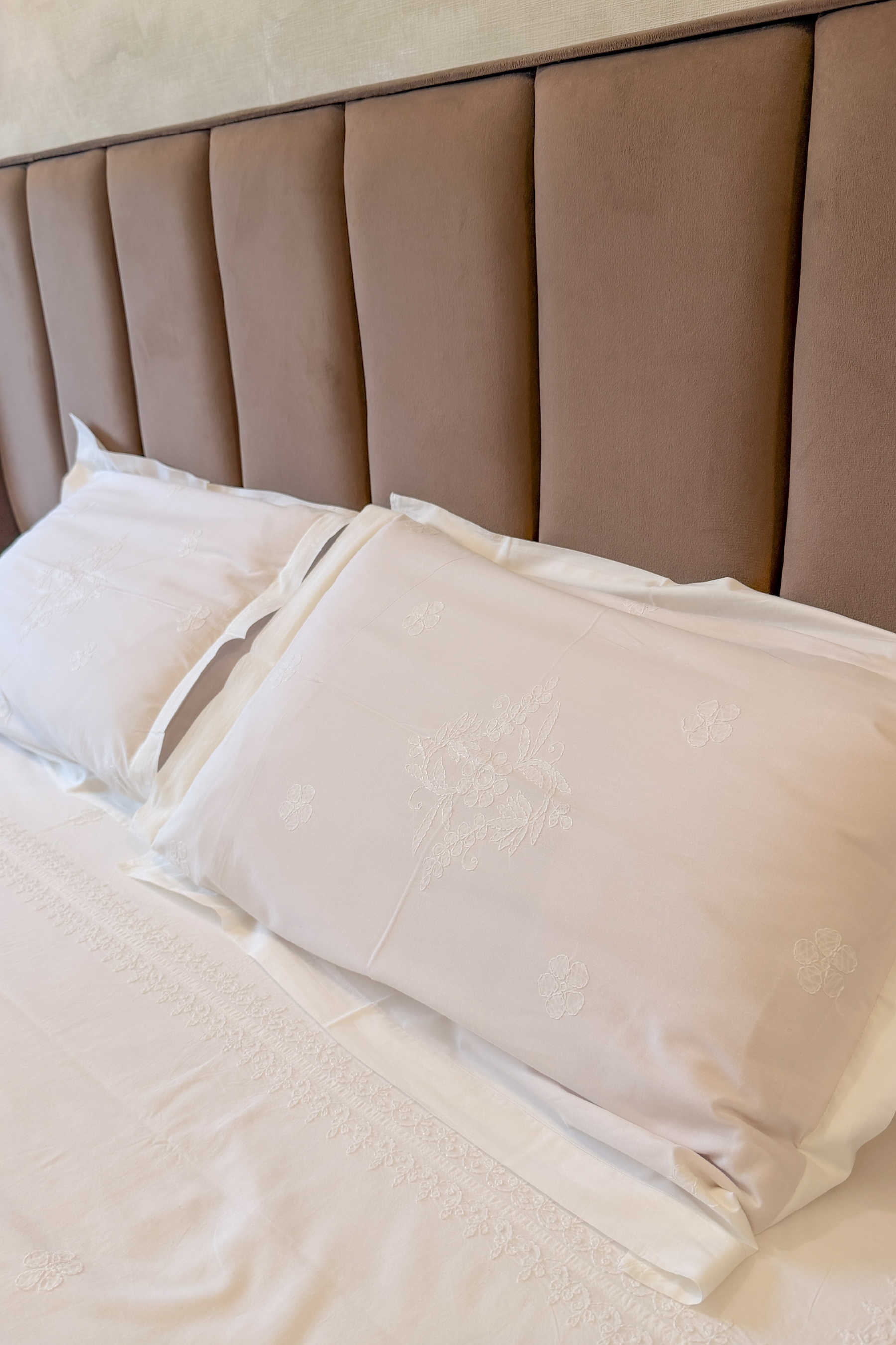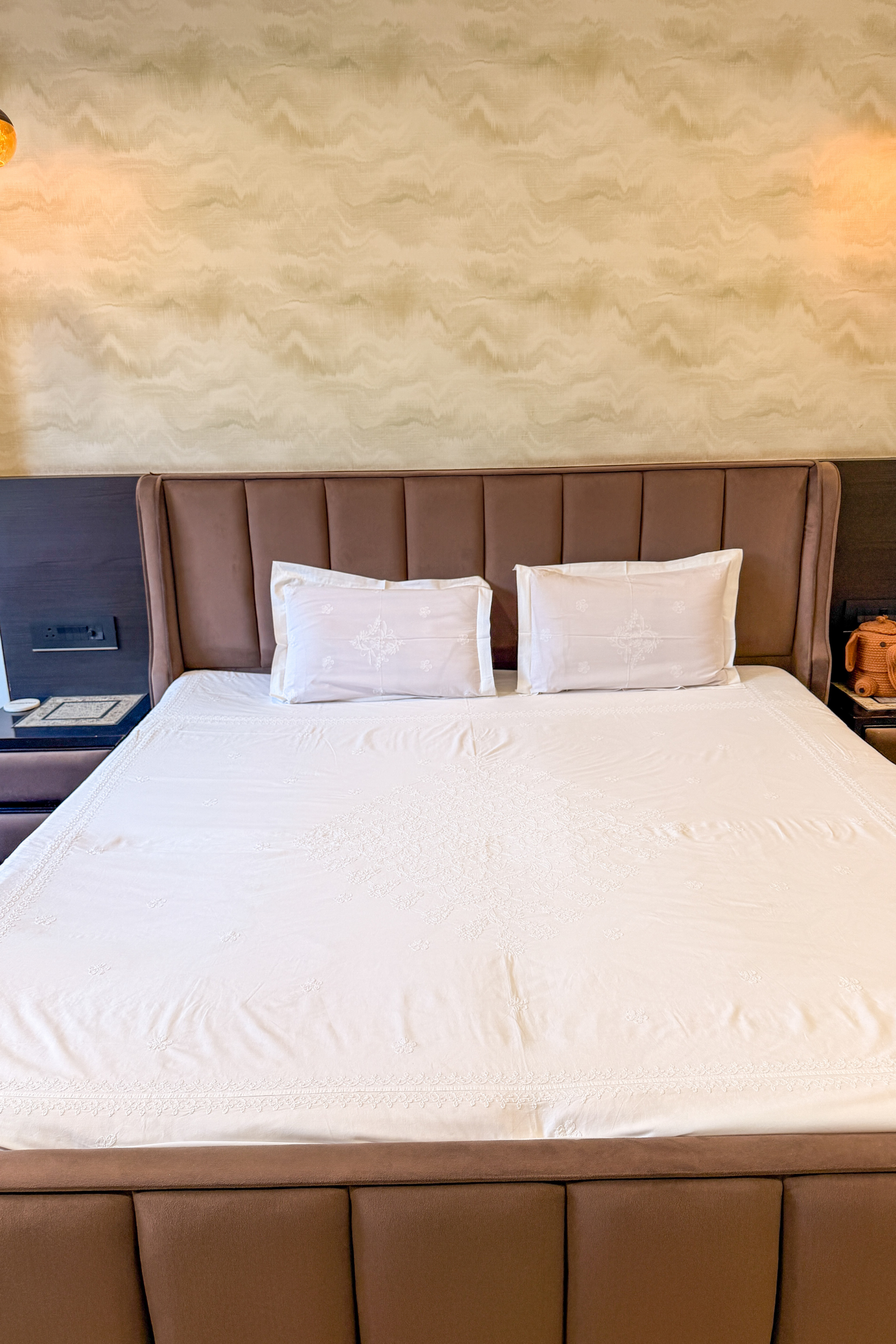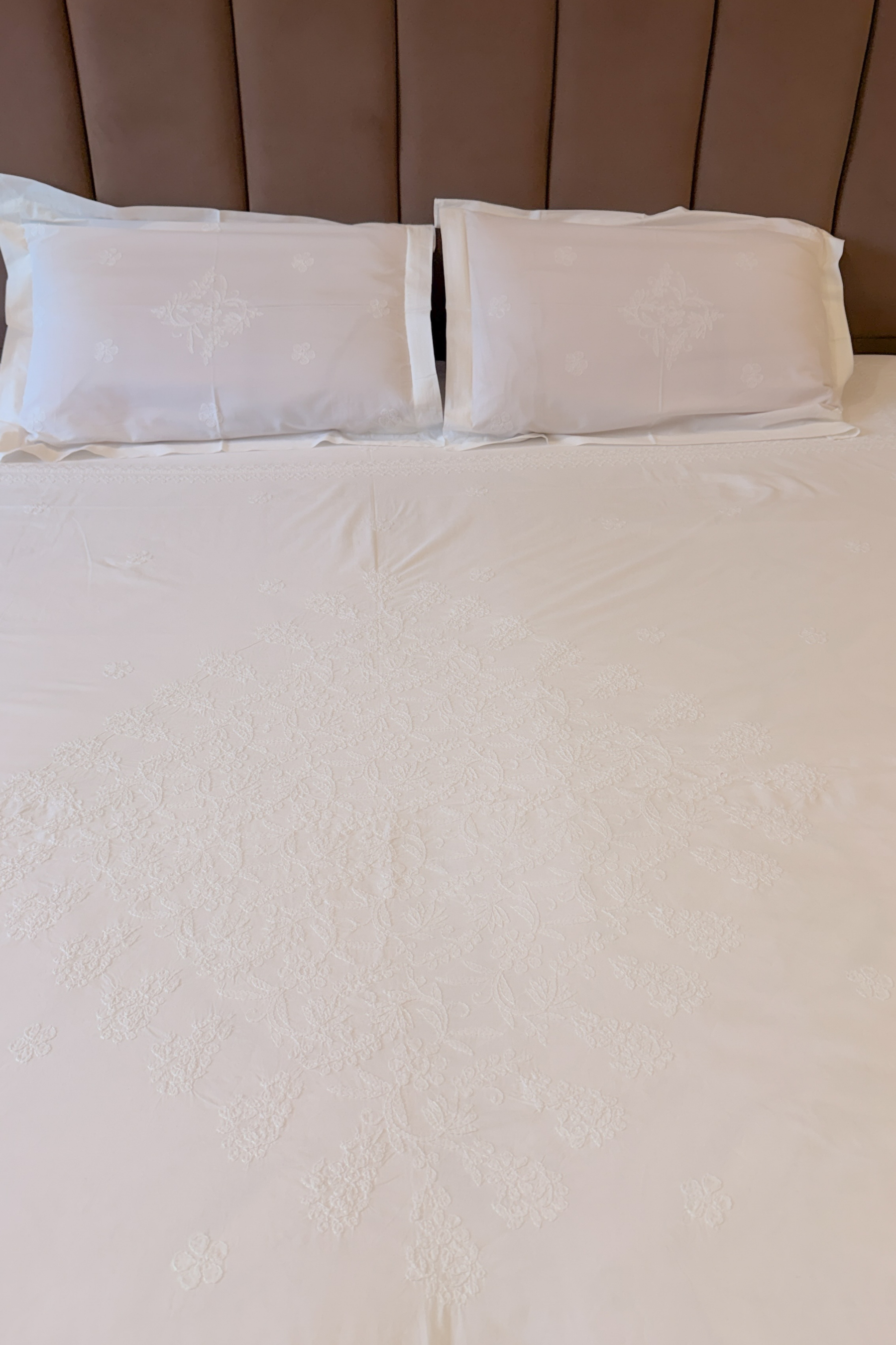 Bring understated luxury and heritage craftsmanship to your bedroom with this elegant hand embroidered Chikankari bedsheet set by Arsh Chikankari. Made from soft, breathable fabric, the bedsheet features a beautifully detailed central floral Chikankari motif, complemented by delicate scattered embroidery throughout. Paired with two matching pillow covers, this white-on-white ensemble creates a serene, refined lookβperfect for both everyday comfort and elevated bedroom dΓ©cor.