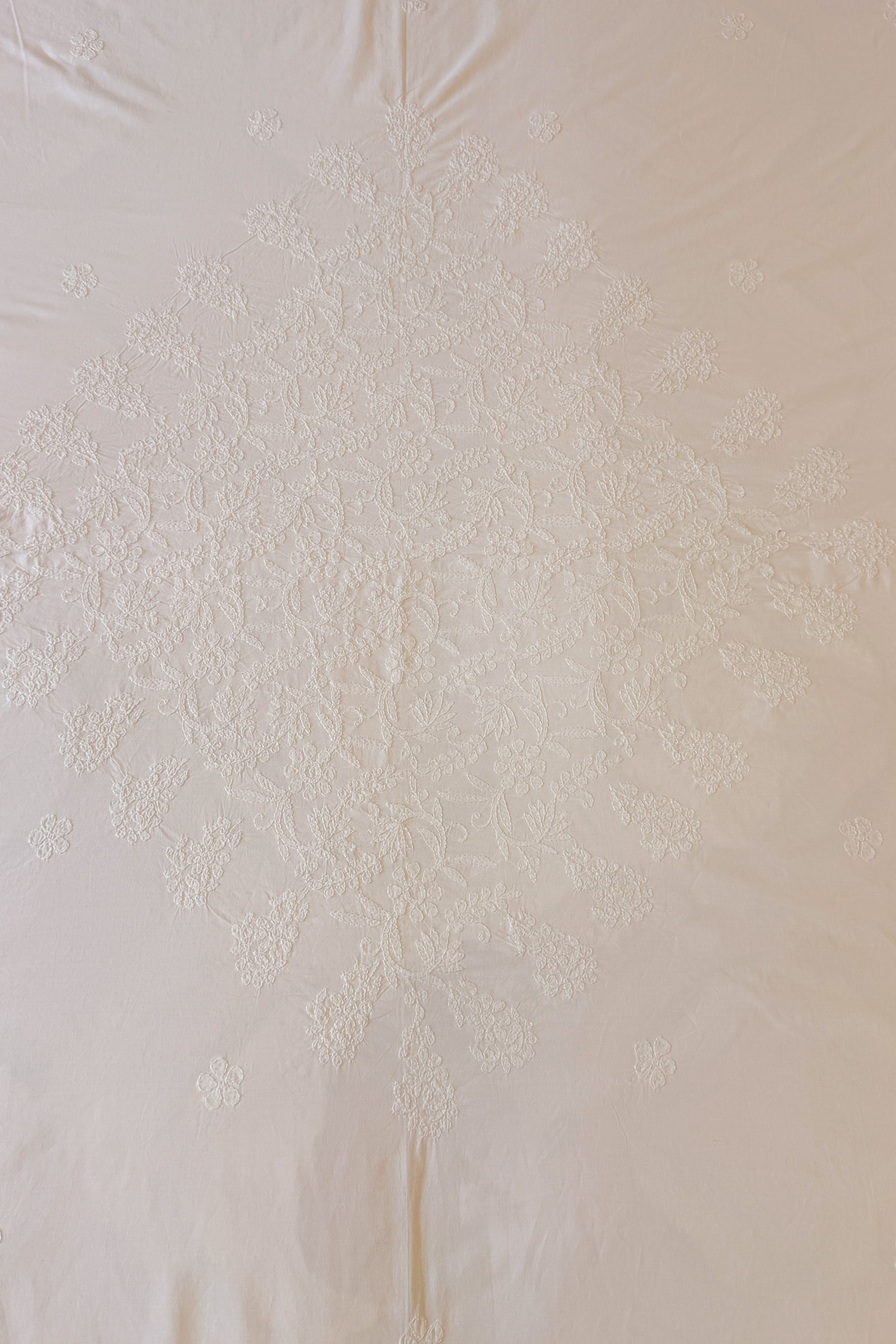 Design: Central floral motif with scattered embroidery