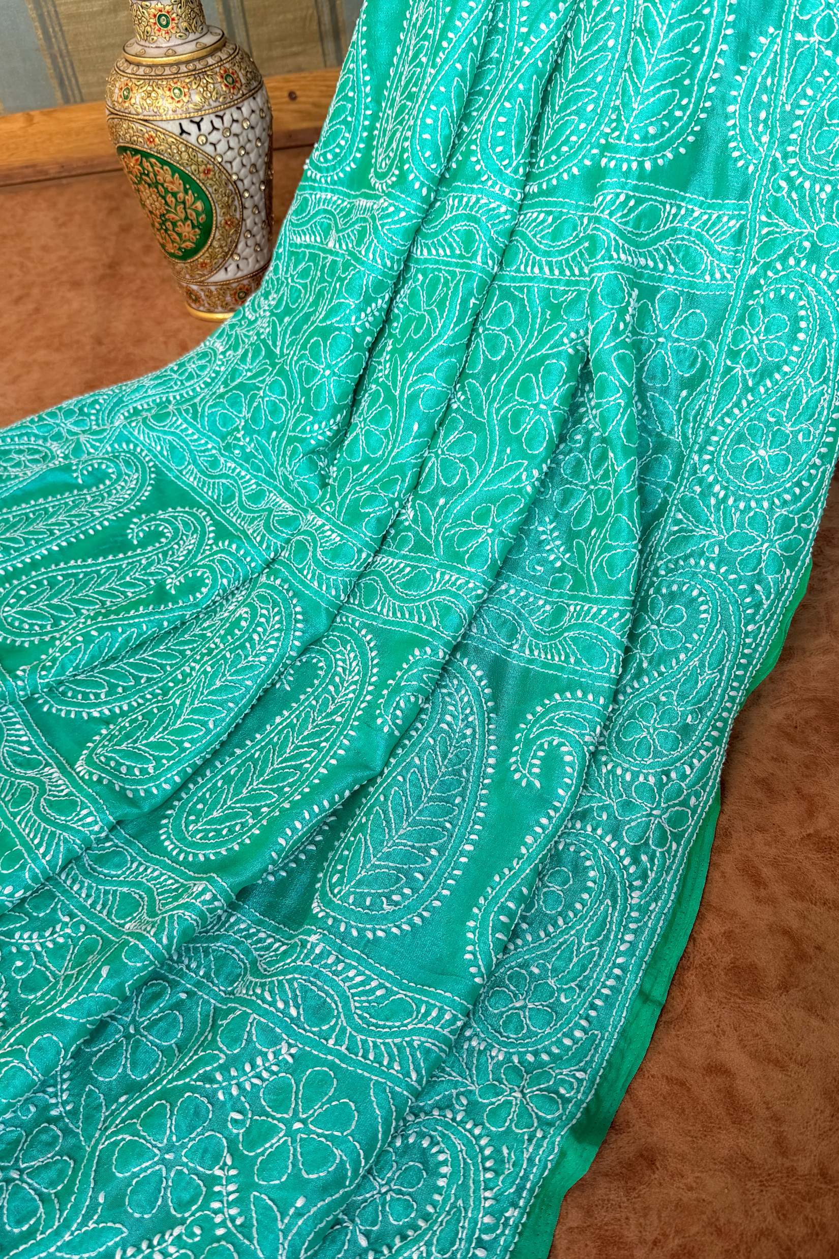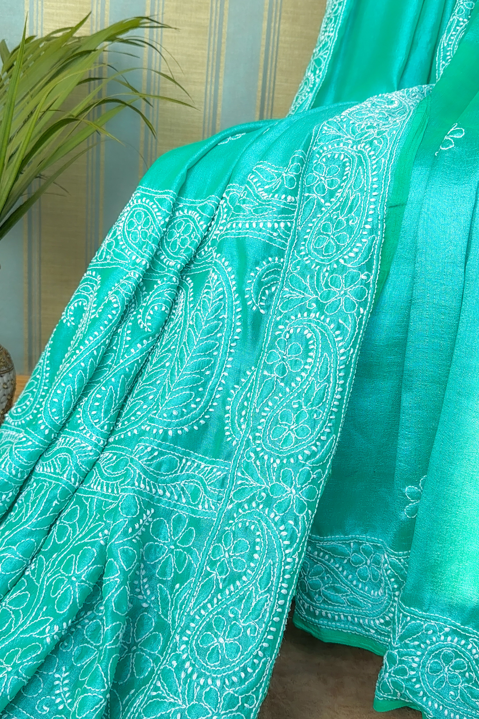 A graceful hand-embroidered Chikankari Saree crafted in luxurious silk fabric, showcasing intricate Palla Jaal embroidery inspired by traditional Lucknowi artistry. The saree features finely detailed paisley and floral motifs, beautifully flowing across the body, complemented by an elegantly embroidered border that enhances its timeless charm.
