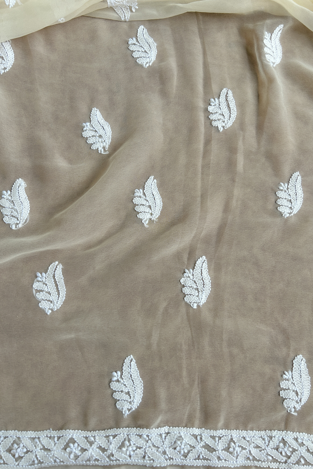 This exquisite unstitched Chikankari set includes a kurti, bottom, and dupatta crafted from semi-georgette fabric. The kurti features intricate Bel embroidery on the sleeves and is adorned with delicate bootis throughout. Its front showcases a richly embroidered vertical jaal panel. The bottom is detailed with a heavy embroidered border and matching bootis. All embroidery is done with fine white thread, highlighting the traditional craftsmanship in a aesthetic beige shade.