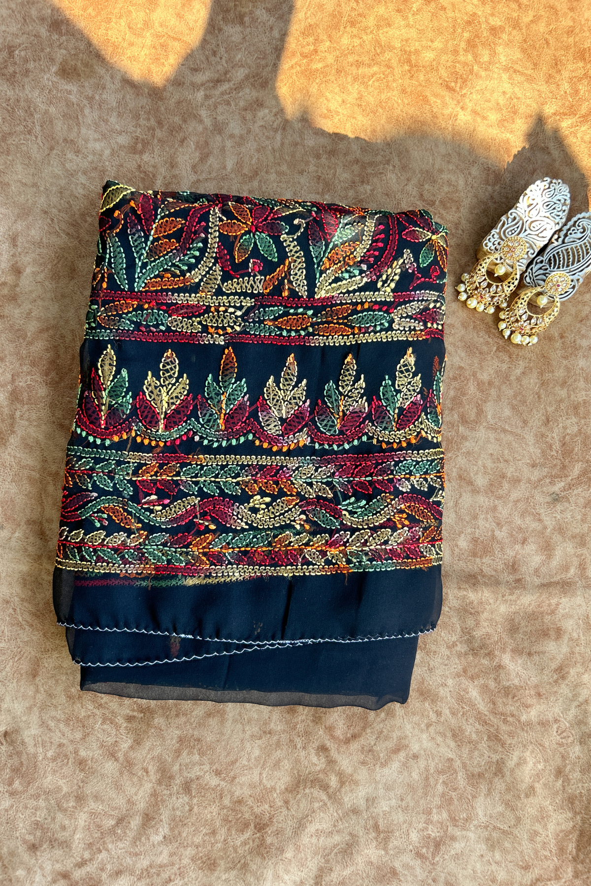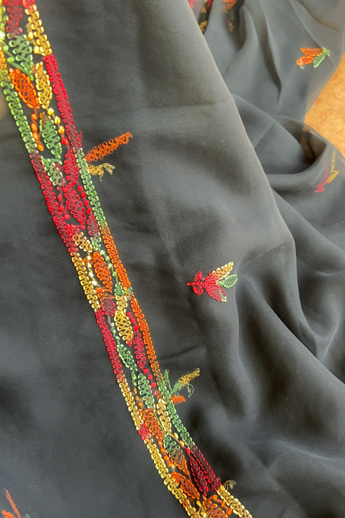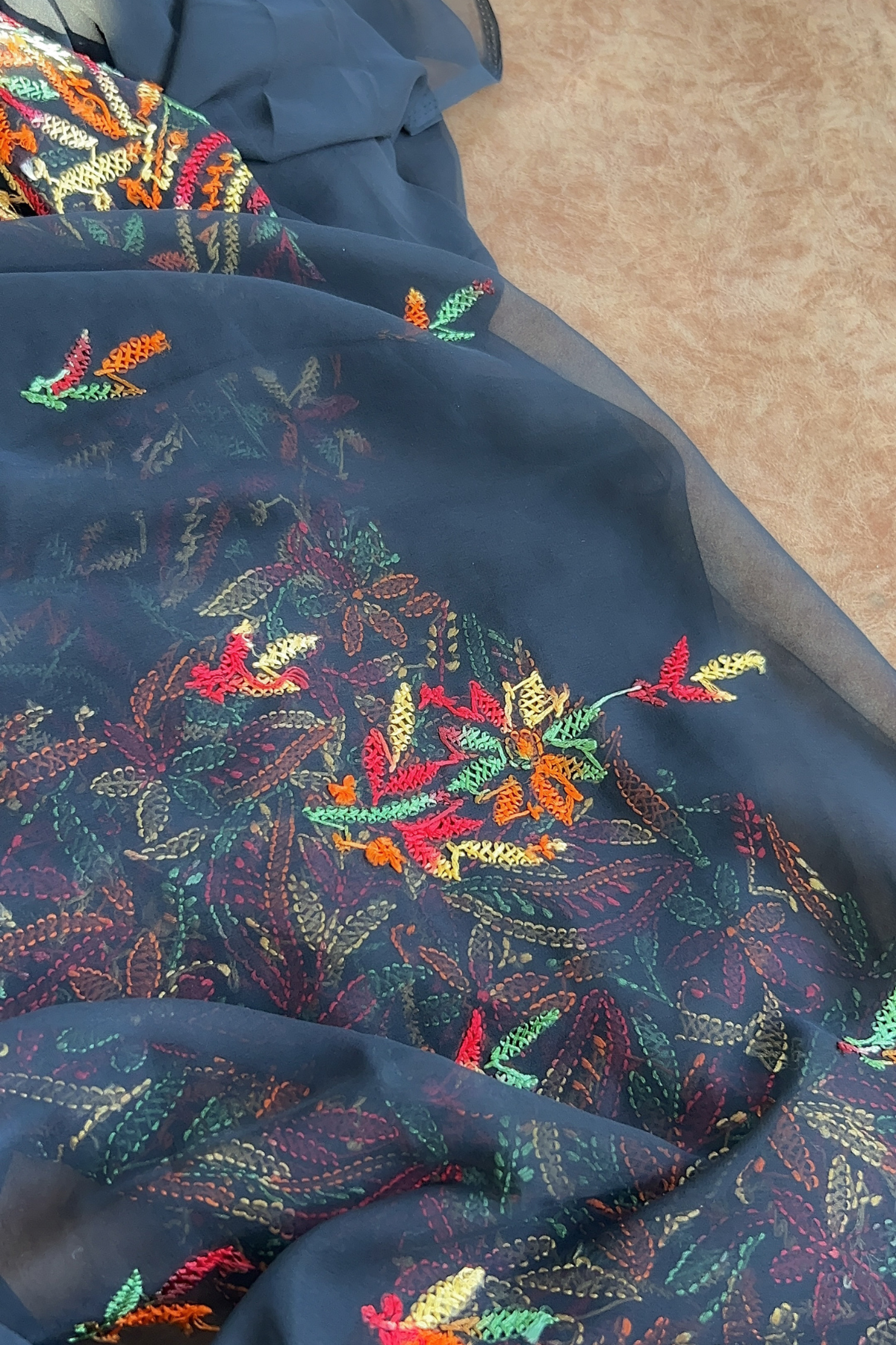 The kurti has handmade full front jaal embroidered on it. The set comes in Black colour with Multi coloured thread embroidery on it.