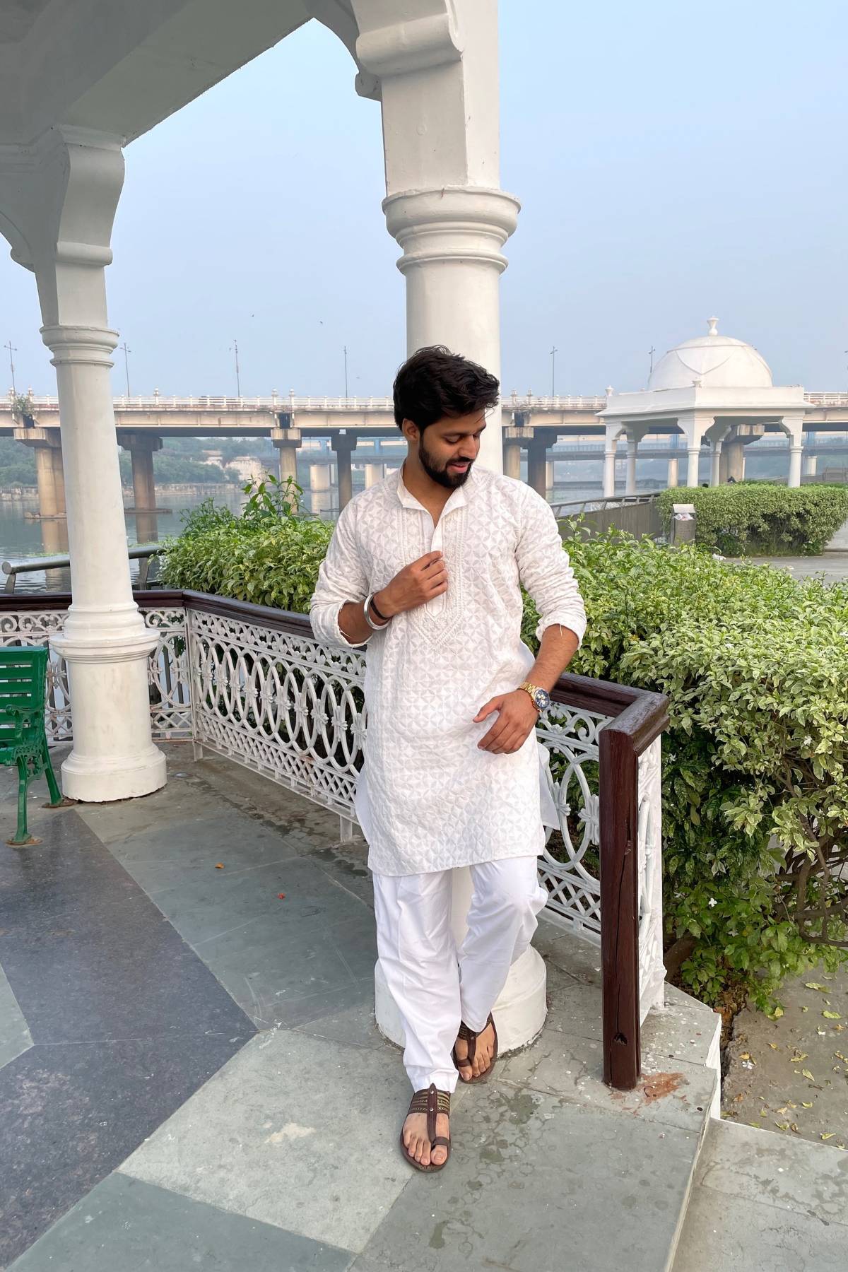 A exquisite hand-embroidered chikan men's kurta with full hand embroidery in the front with the same coloured thread. The kurta has Bakhiya, Shadow and Phanda hand embroidery on it.