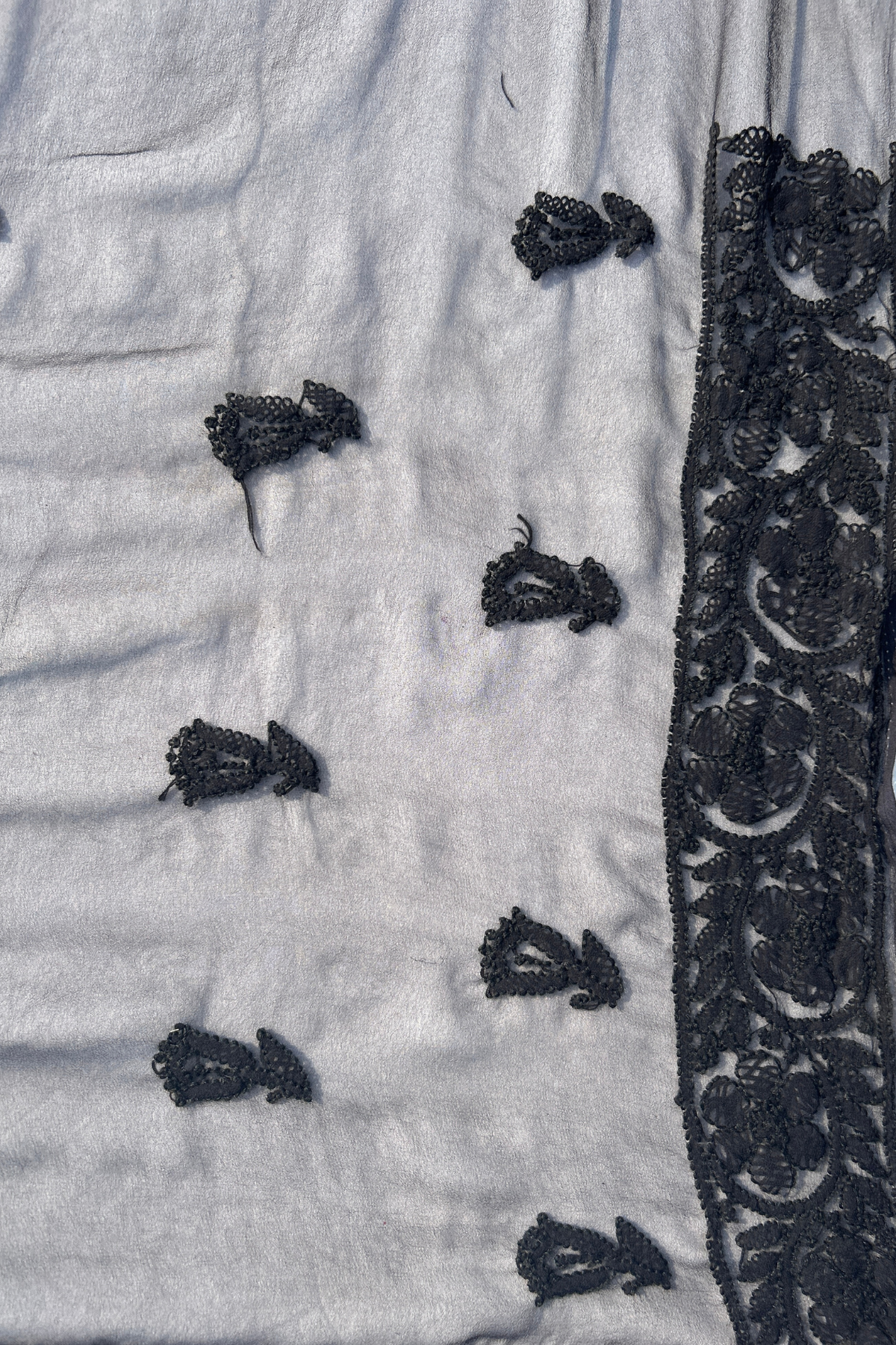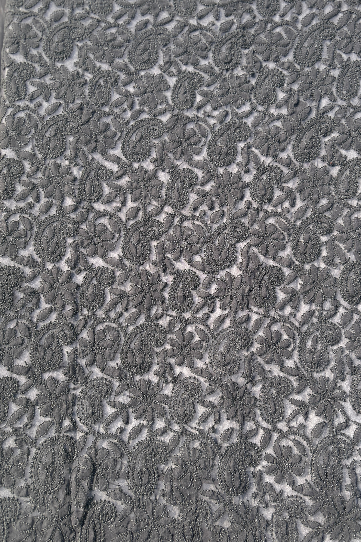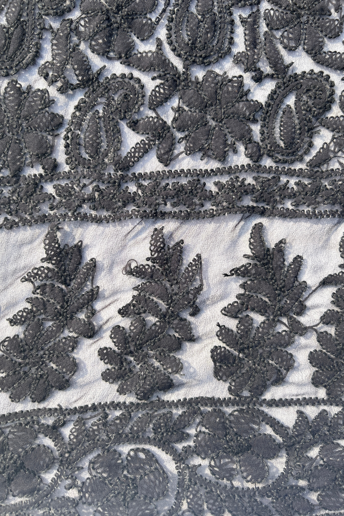 A beautiful hand embroidered Unstitched Chikankari Kurti on Semi Georgette fabric with full front jaal embroidered with bakhiya and phanda stitch, has heavy daaman design on it. The kurti has embroidery on it from Black colour on Black colour fabric.
