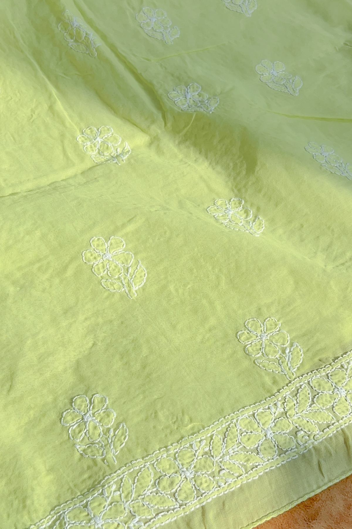 A beautiful hand embroidered Unstitched Chikankari Kurti, Bottom and Dupatta set. The Kurti and Bottom is of Pure Cotton fabric and Dupatta is of pure Chiffon with crochet border on it.