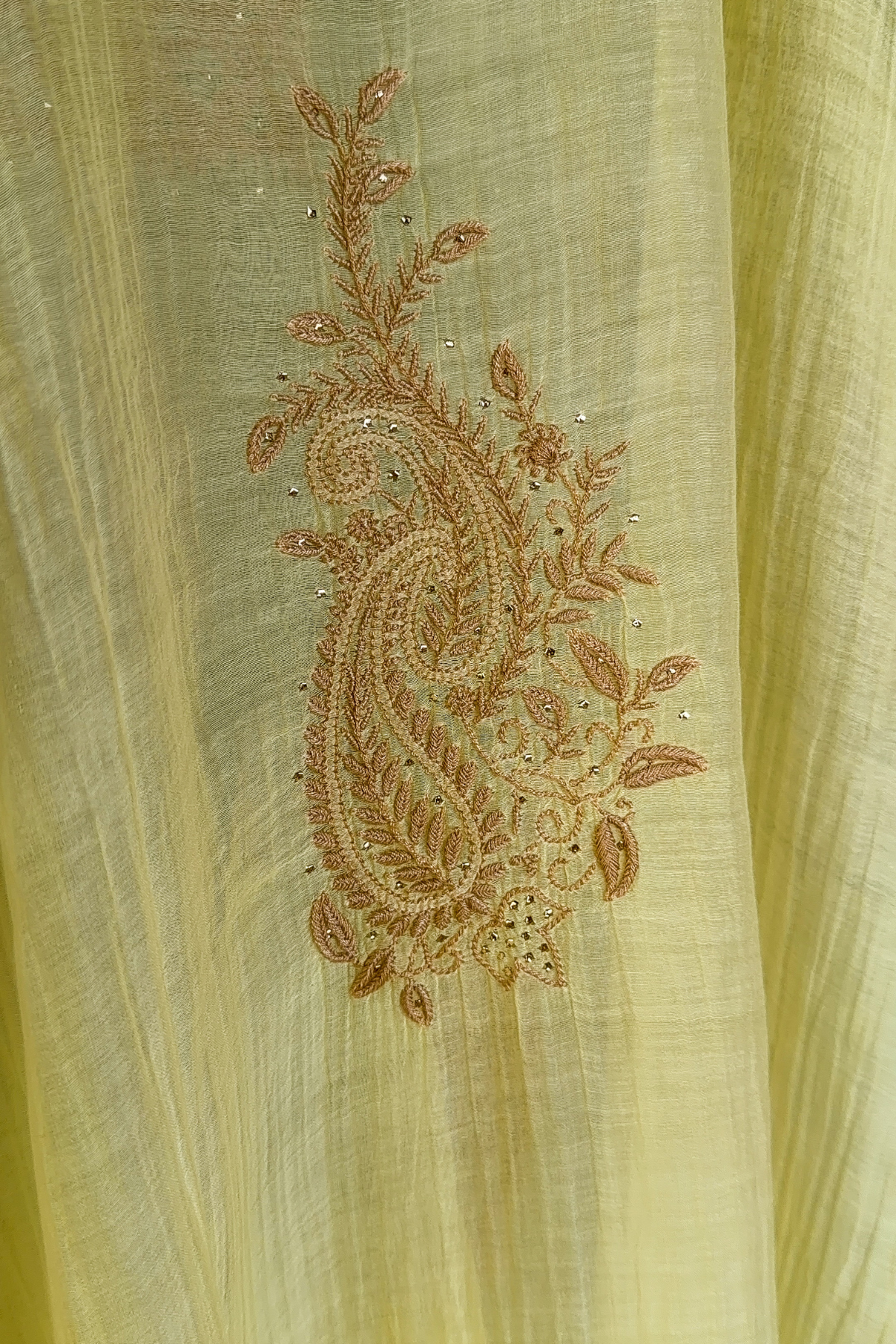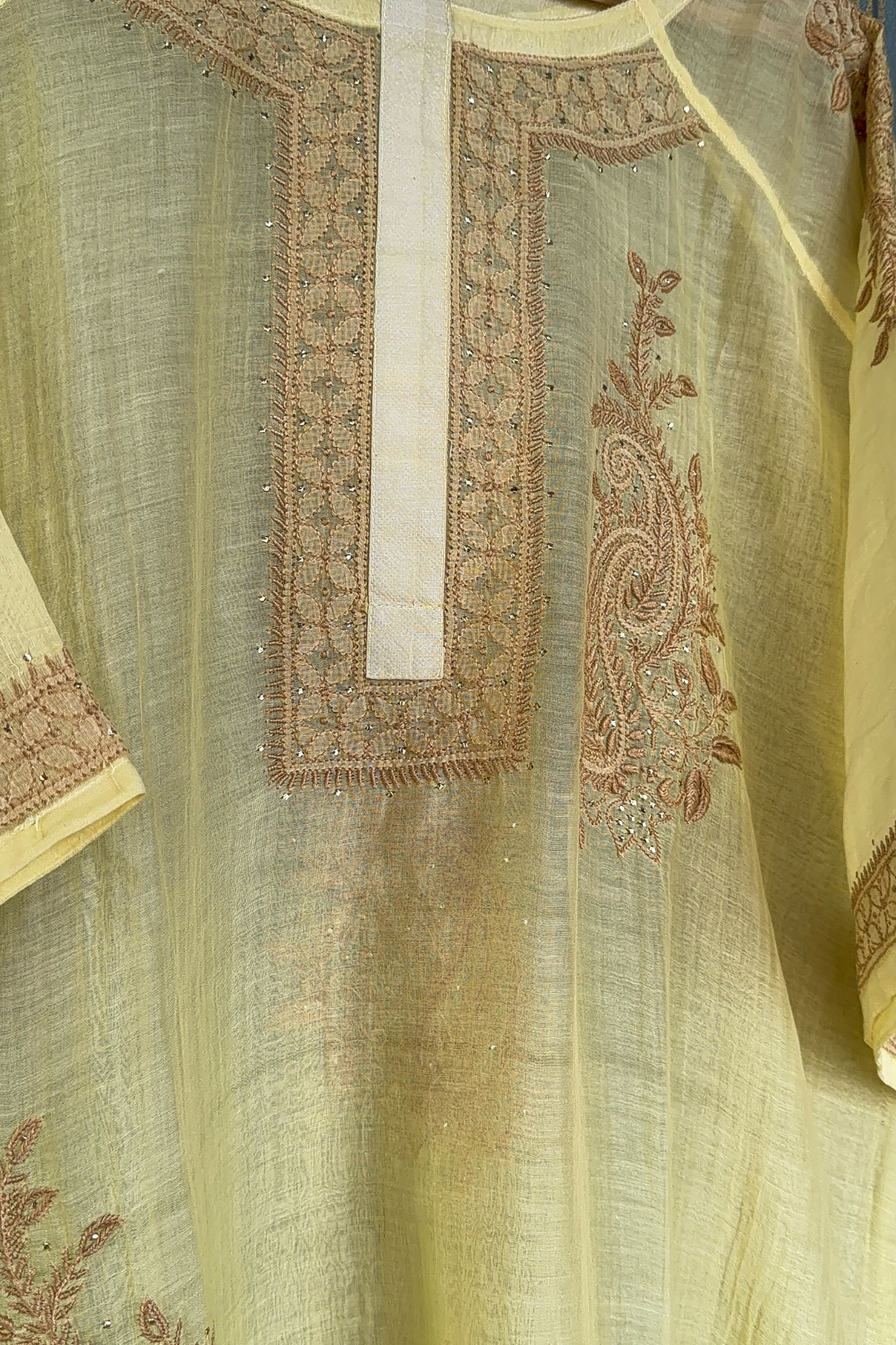 This exquisite semi-stitched ensemble showcases traditional chikankari artistry on premium pure tissue fabric. The kurti features intricate hand-embroidered detailing in contrasting beige thread, with refined center work and bold motifs adorning the neckline and border. Golden muqaish embellishments add opulent shimmer throughout the design. The coordinating dupatta completes the sophisticated look with matching embroidery. Perfect for those who appreciate authentic handcrafted textiles and timeless elegance.