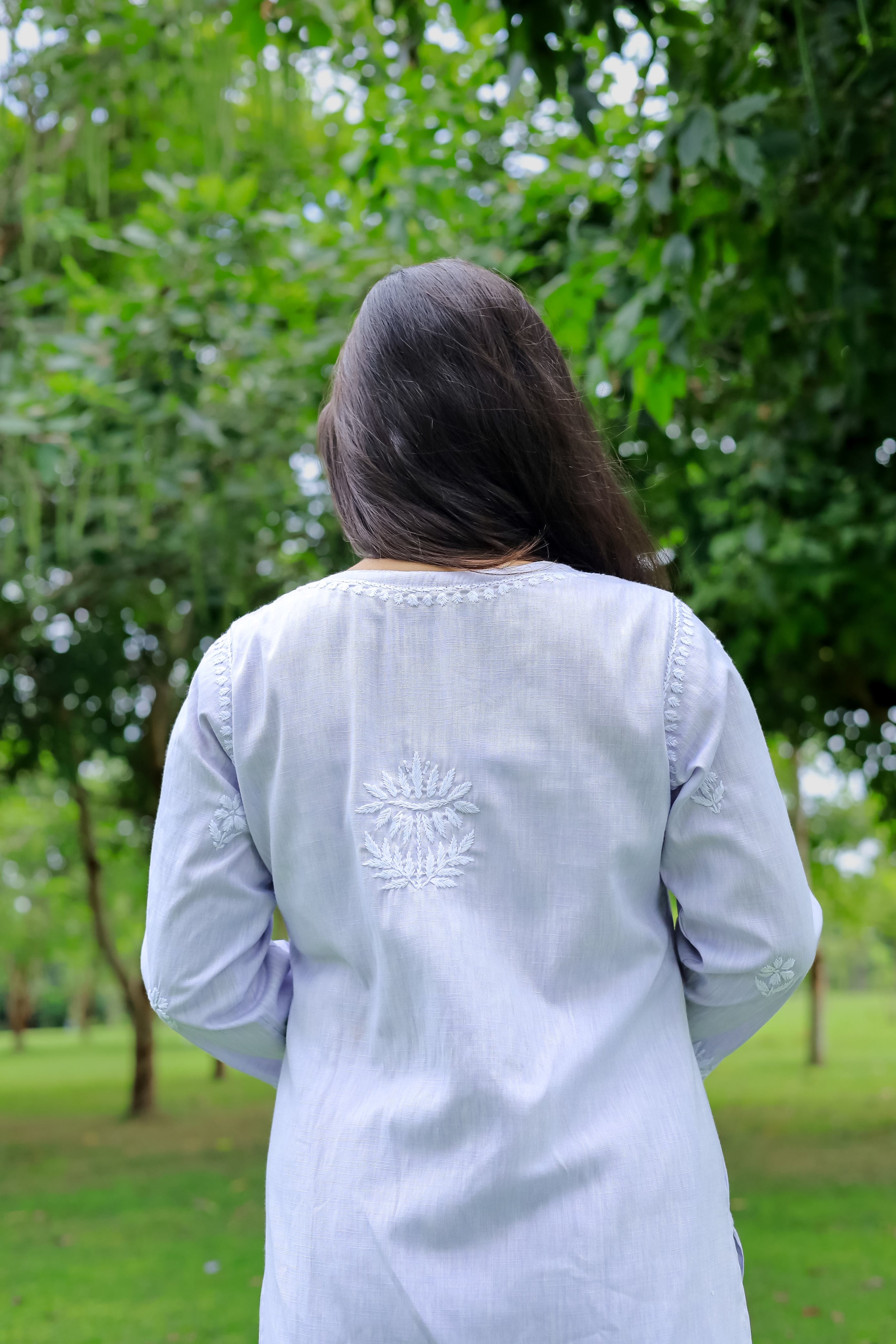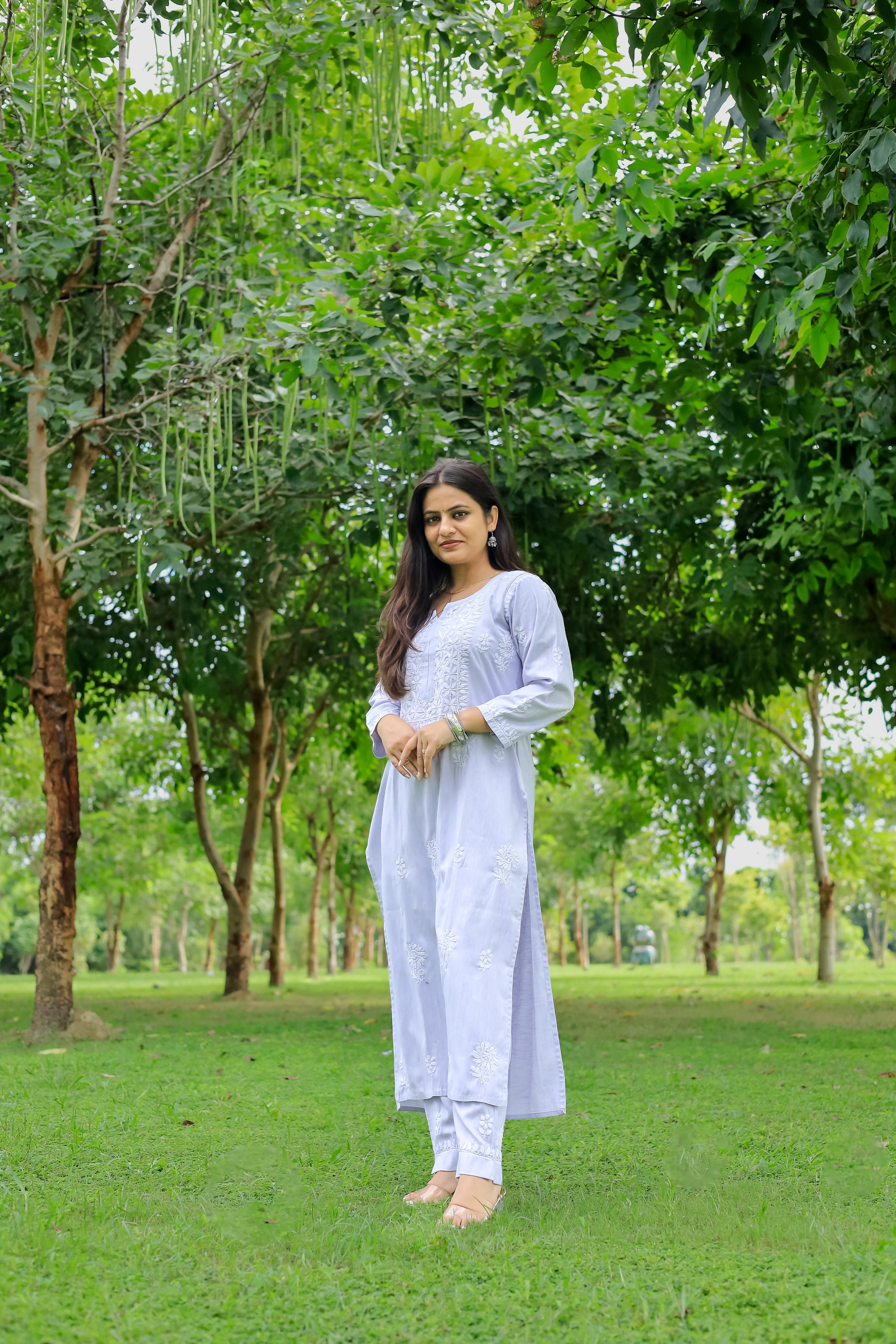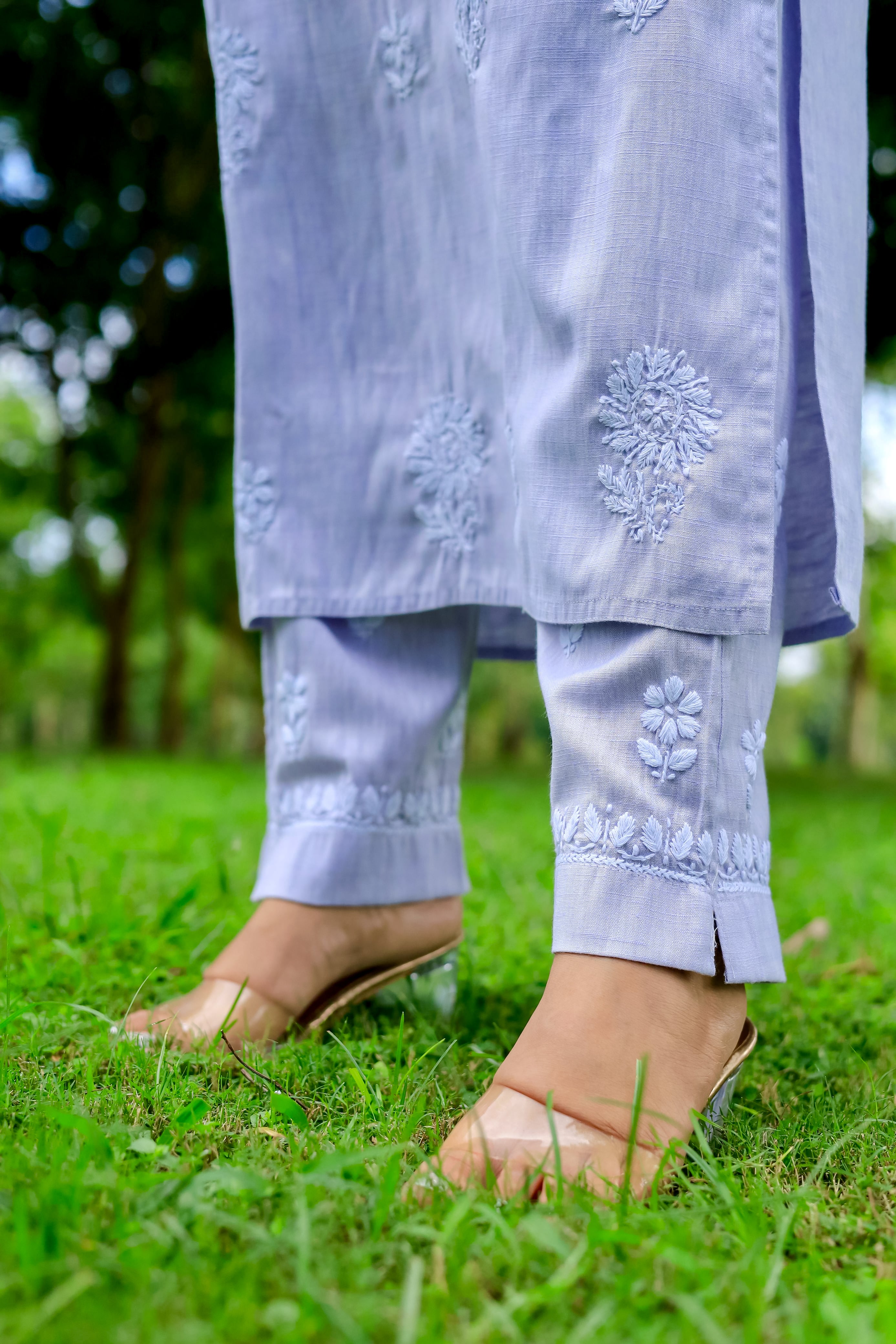 A beautiful hand embroidered Kurti and Plazzo set in Linen Cotton fabric having embroidery on it from white thread. Very comfortable and premium feel of the fabric. It has heavy Neck and daaman embroidered with all over motifs on the kurti with heavy Bel and heavy motifs on the bottom.