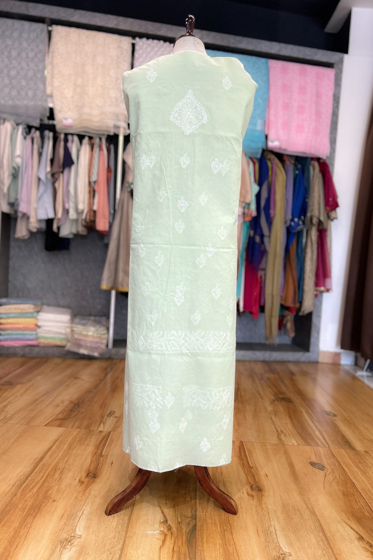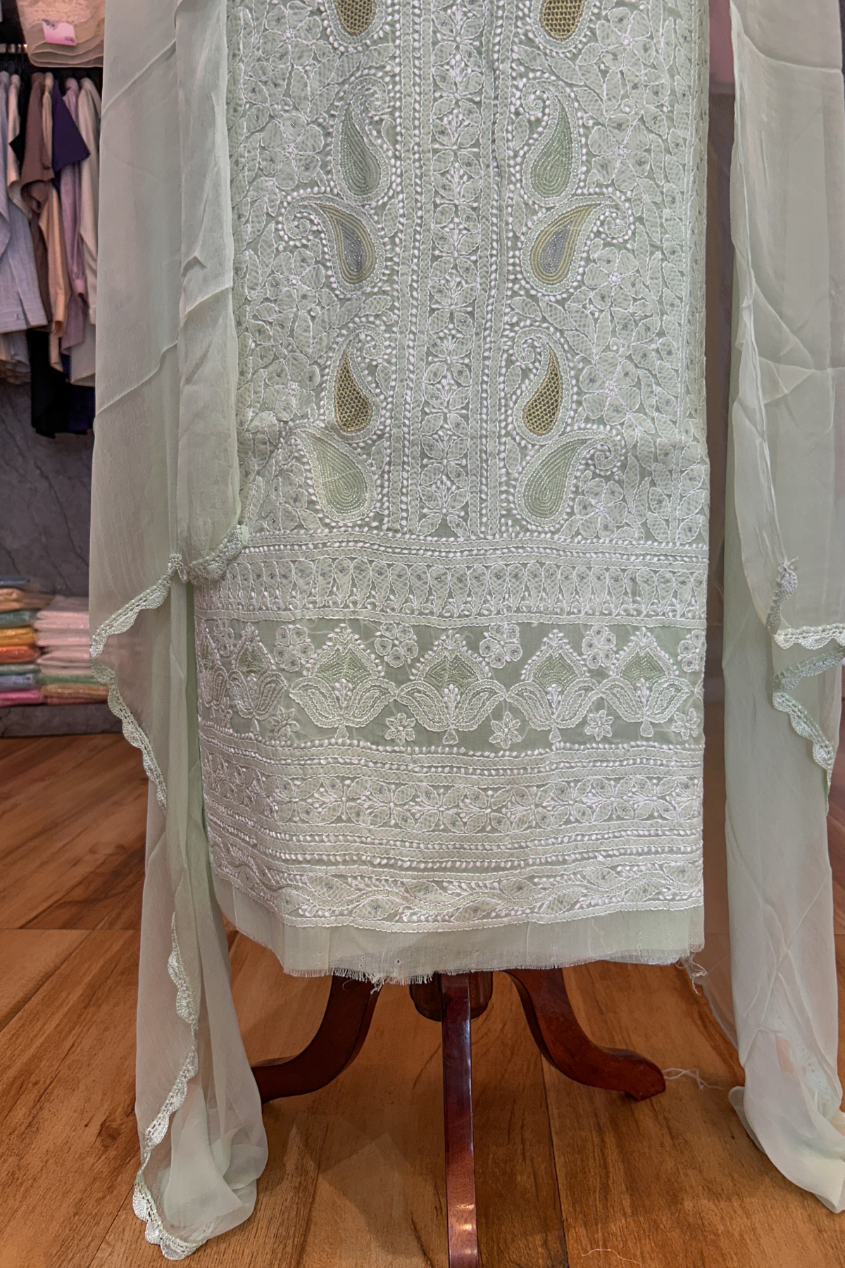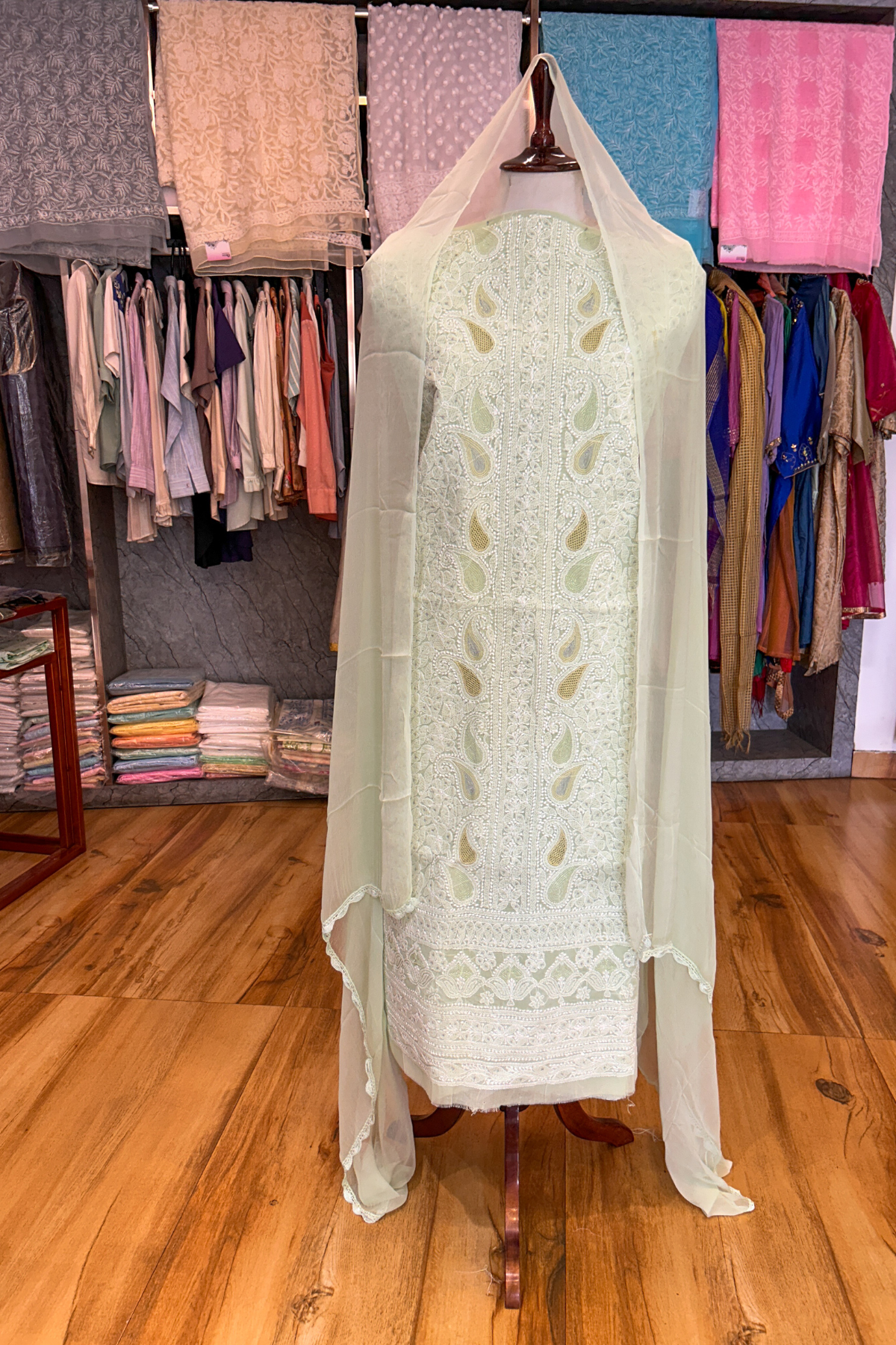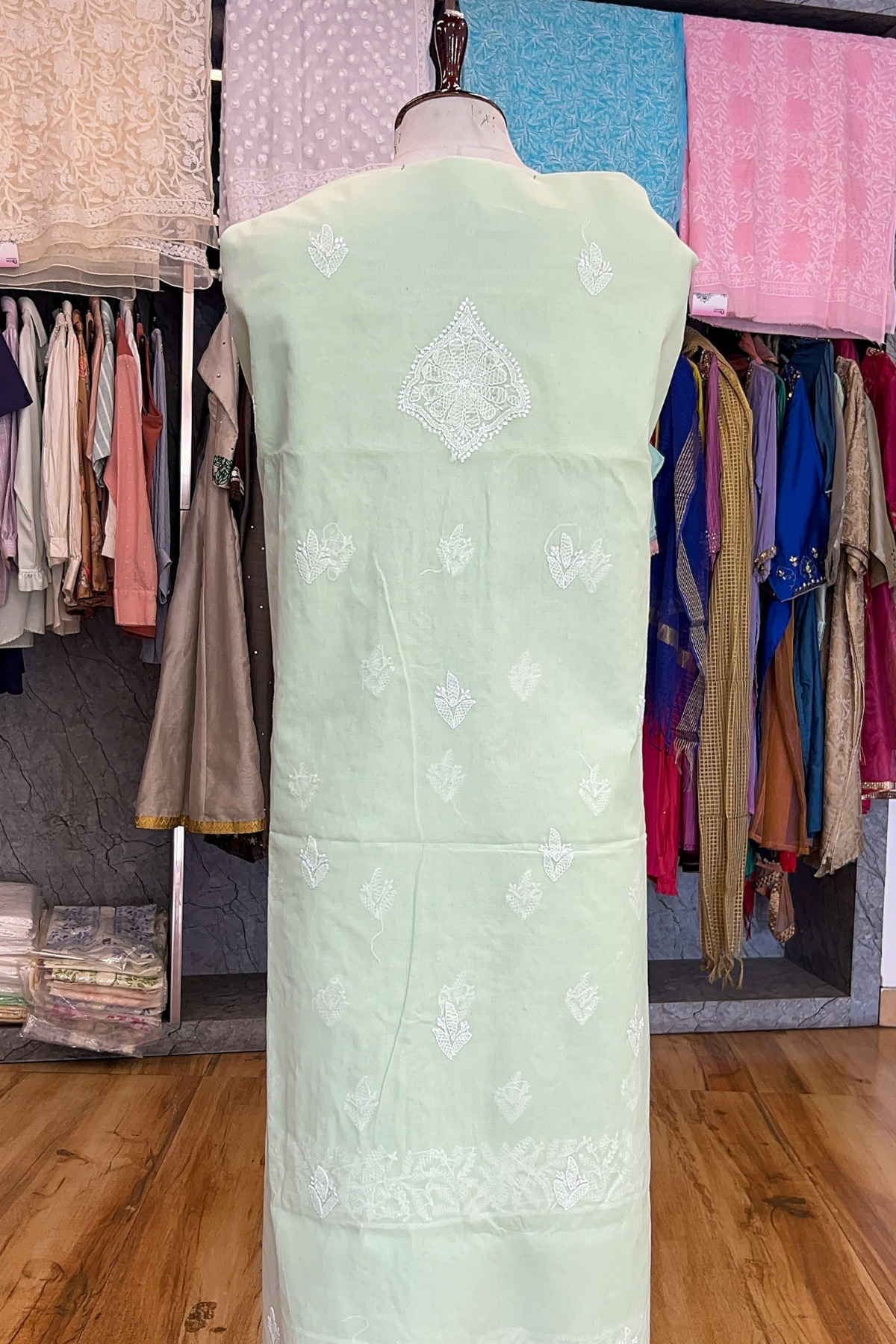 A beautiful hand embroidered Unstitched Chikankari Kurti, Bottom and Dupatta set. The Kurti and Bottom is of Pure Cotton fabric and Dupatta is of pure Chiffon with crochet border on it. The suit has fancy jaal work on the front with add on Zari embellishments of Aari, Moti, Kasab and Pure Resham Jaali work on it.