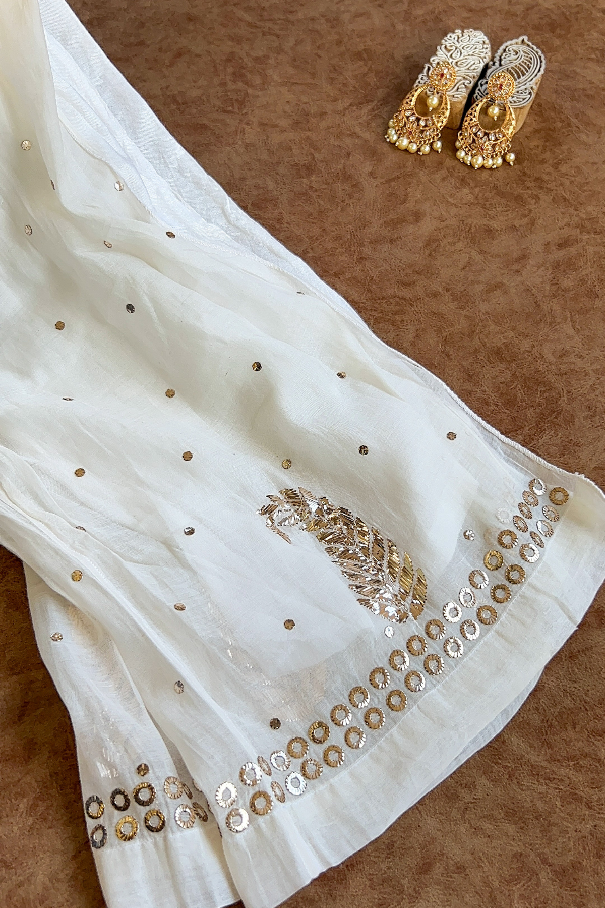 A beautiful hand embroidered shirt and pant set in Pure Mul Chanderi fabric having only embellishments on it from Golden Muqaish. The fabric is very comfortable and offer premium feel to the skin. It has medium Kurti length paired with Smart Pants with Mukesh embellishments.
