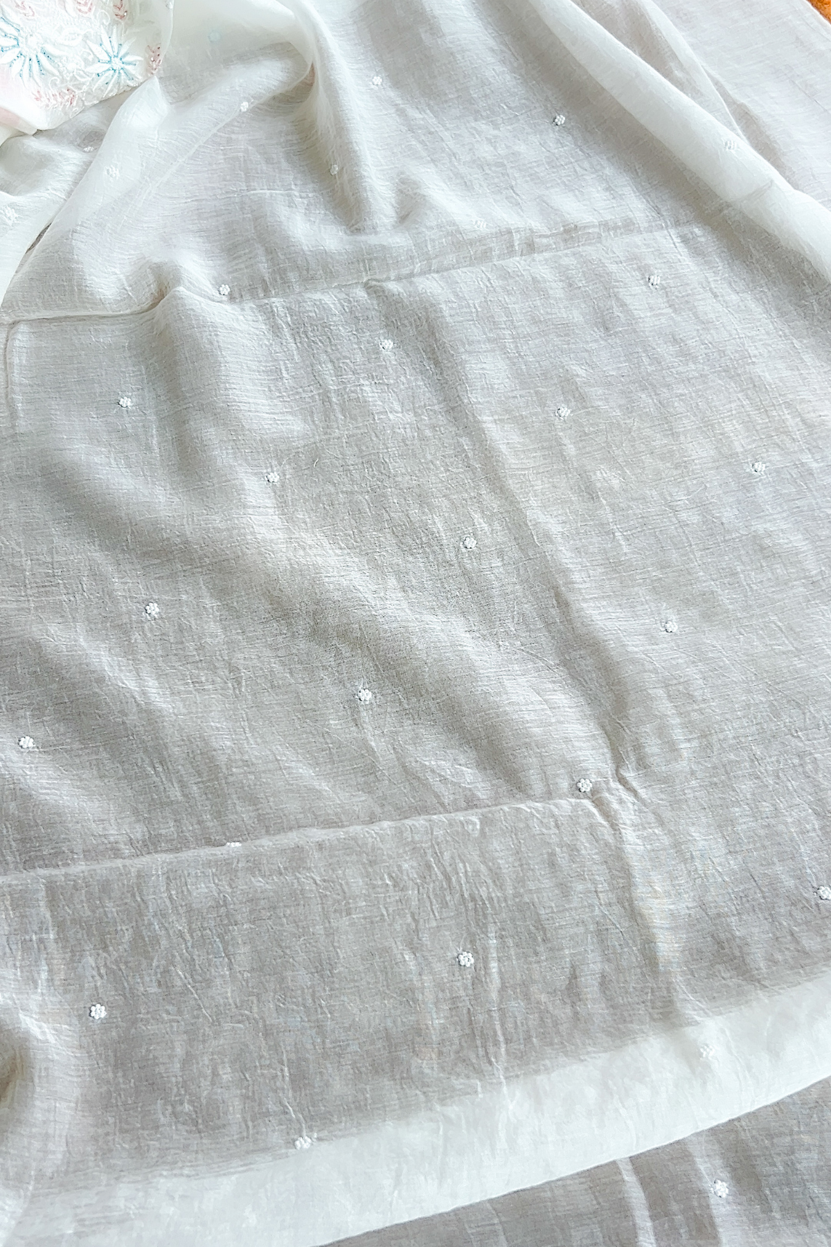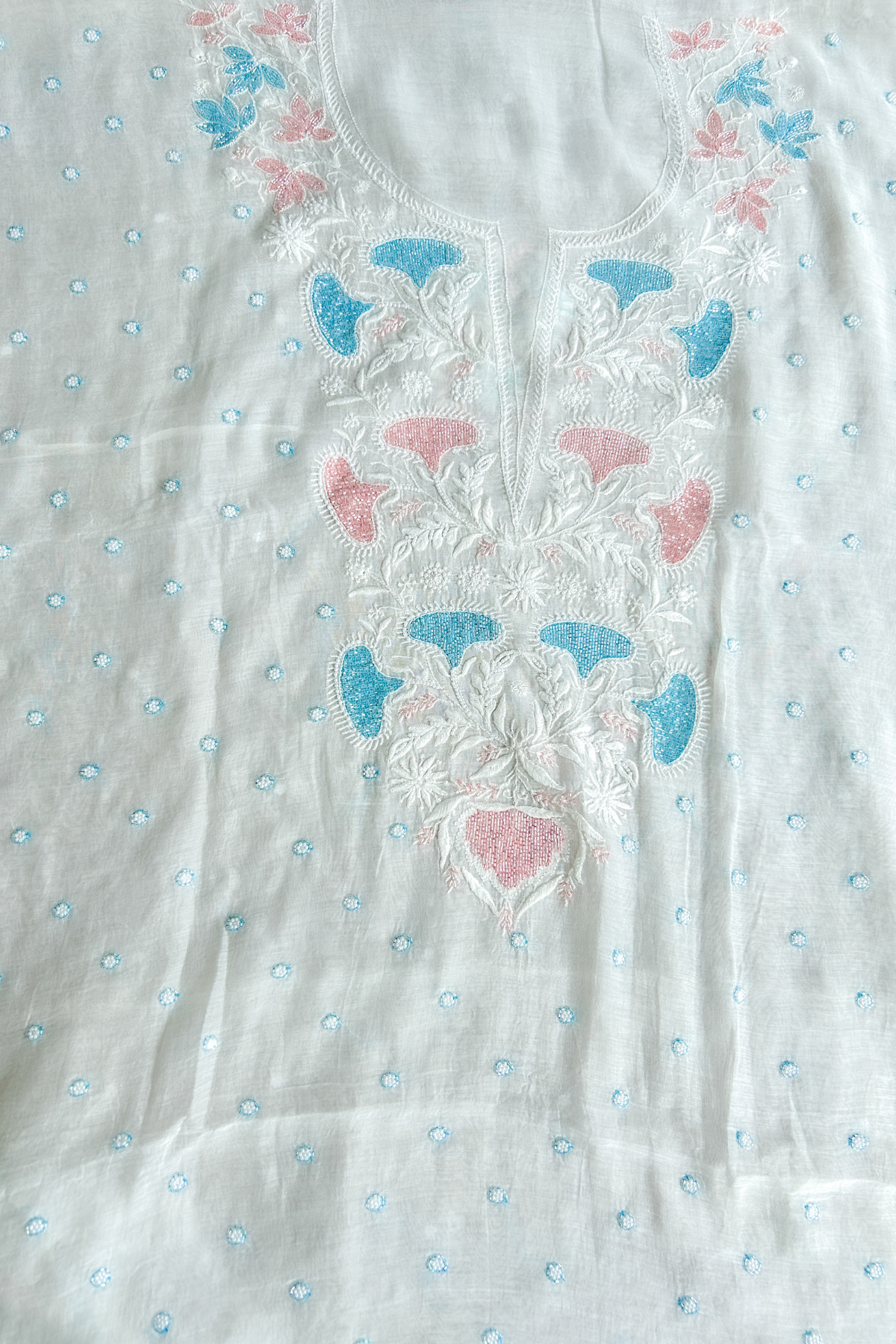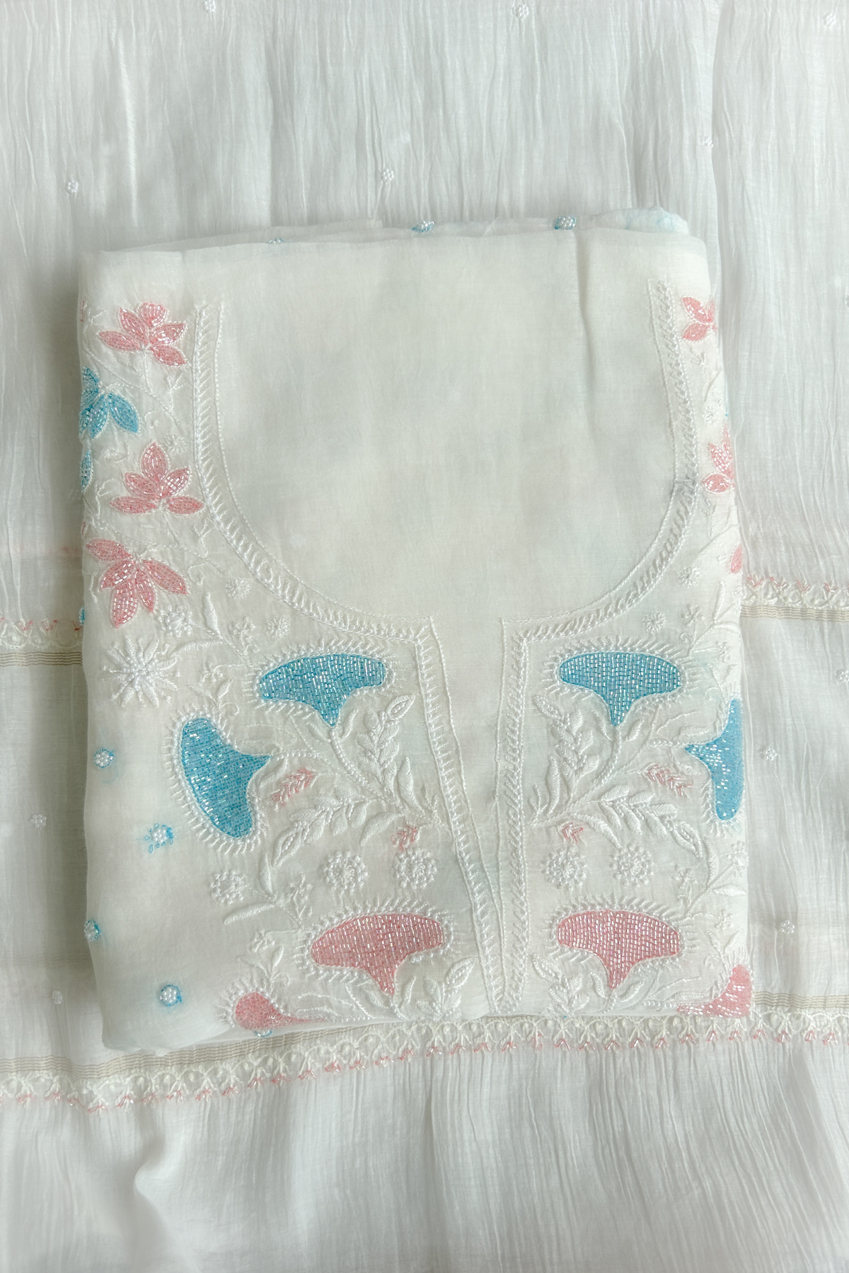 A beautiful hand embroidered Unstitched Chikankari Kurti and Dupatta set specially crafted for women. The Kurti and Dupatta are of Pure Mul Chanderi fabric. The kurti has heavy Bel embroidered on it`s sleeves with all over Zari booti on it. The kurti has heavy neck with two colour contrast embellishments on it.