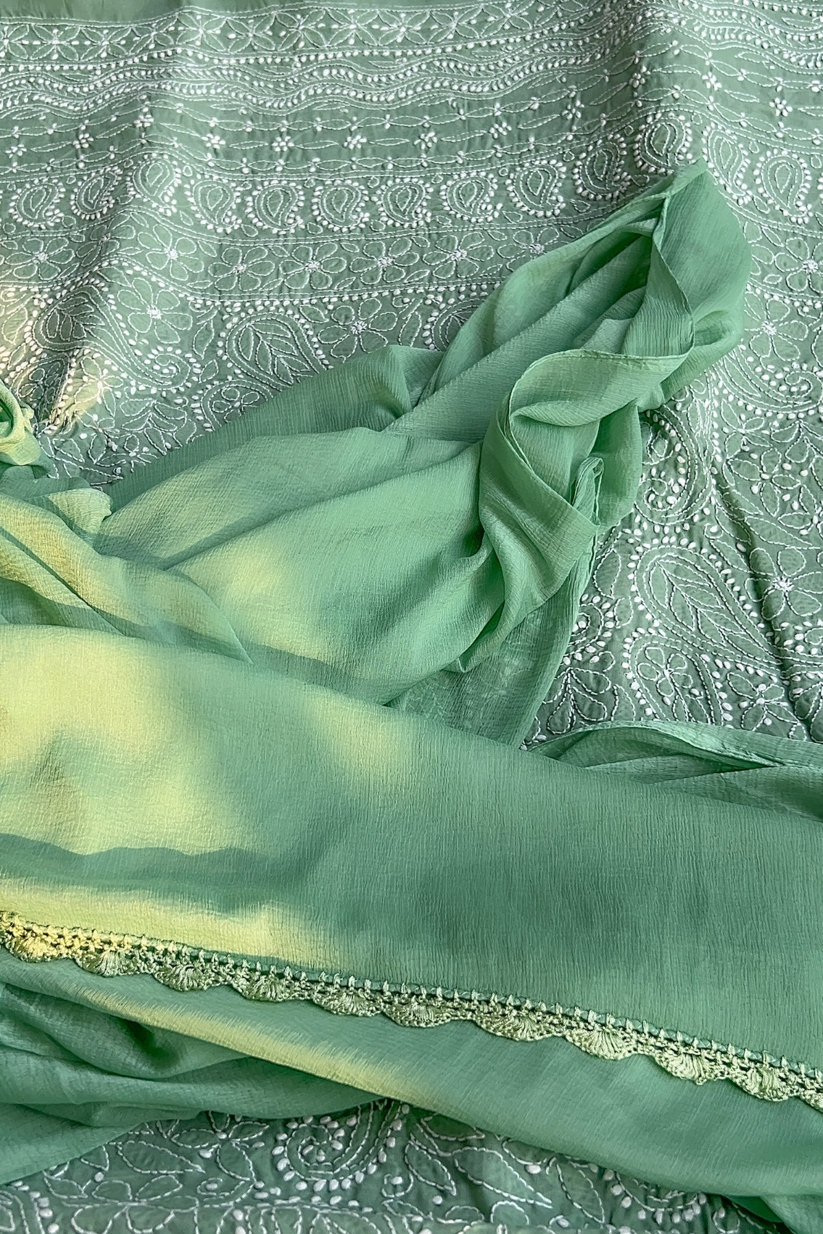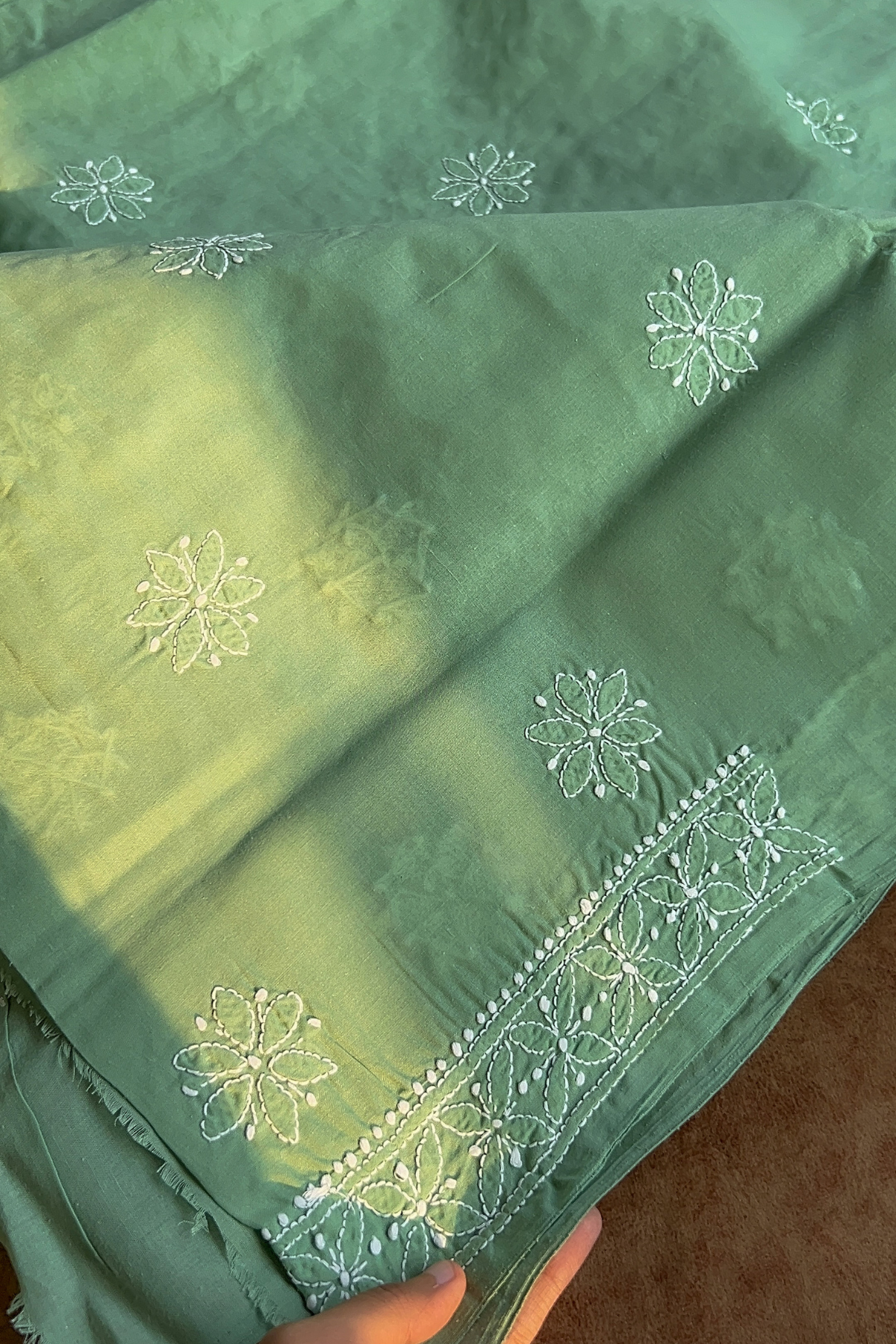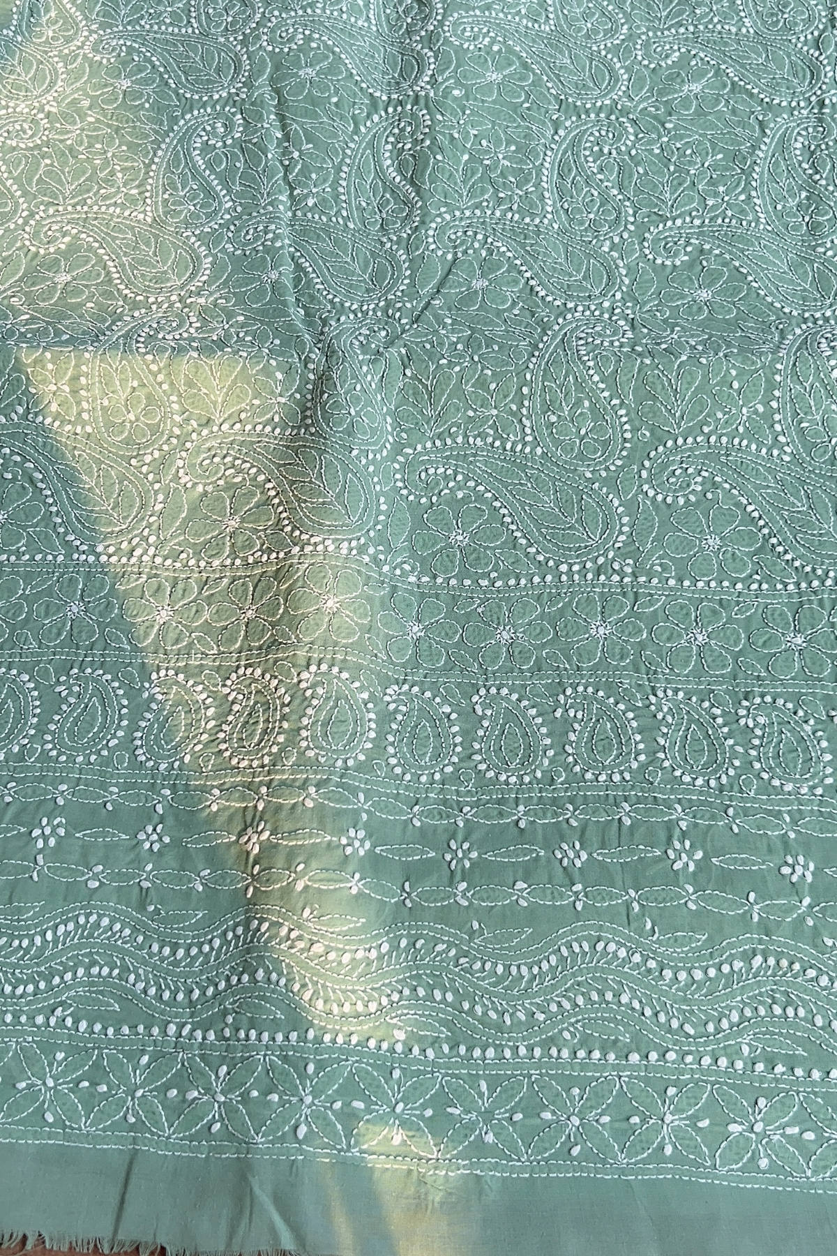 A beautiful hand embroidered Unstitched Chikankari Kurti, Bottom and Dupatta set specially crafted for women. The Kurti and Bottom is of Pure Cotton fabric and Dupatta is of pure Chiffon fabric with crochet border on it. The kurti has heavy Bel embroidered on it`s sleeves with all over bootis on it with having full front jaal embroidery with kairi design. The bottom has heavy Border with heavy bootis embroidered on it