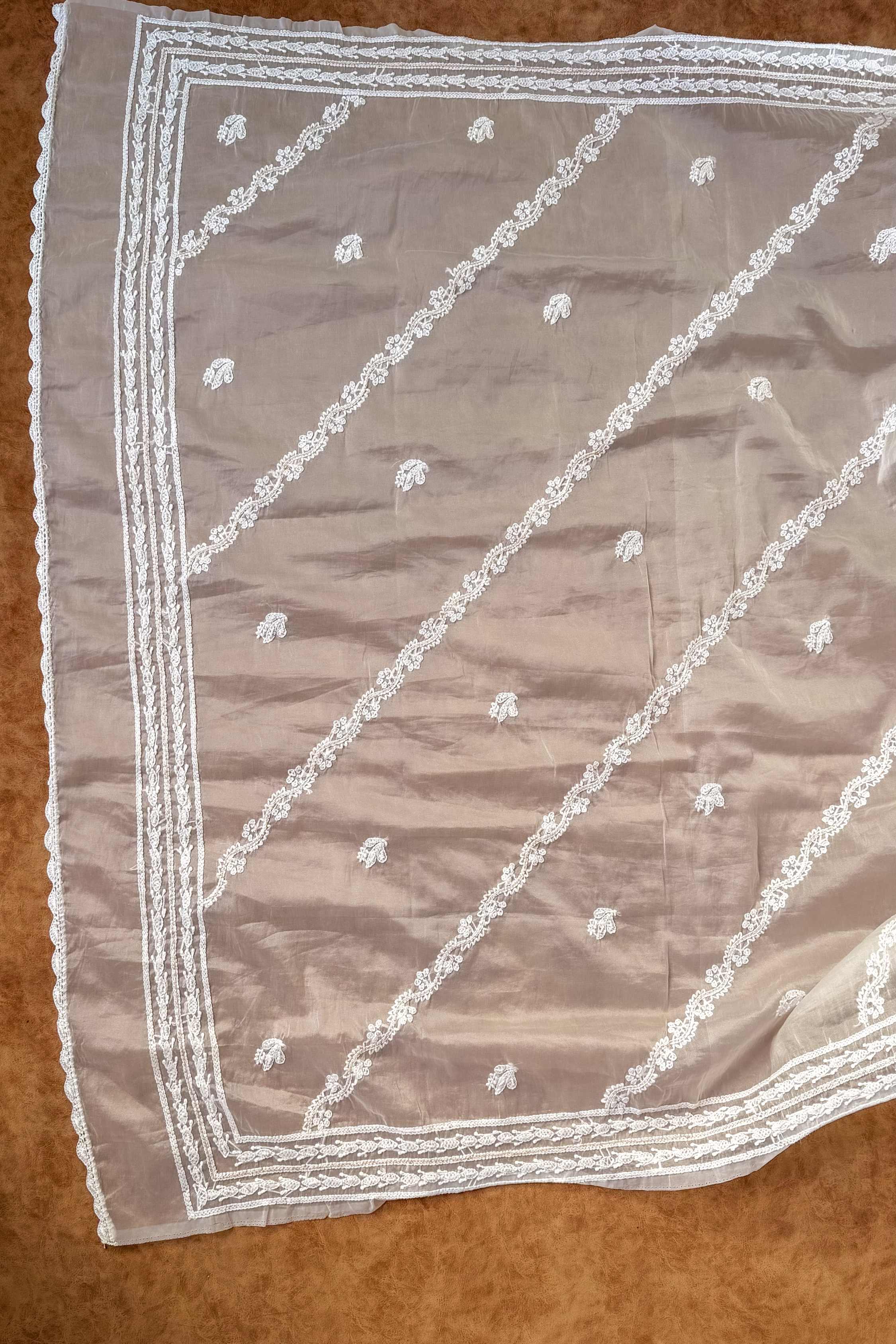 This exquisite dupatta showcases the refined artistry of traditional Chikankari embroidery, meticulously handcrafted by skilled artisans using delicate white thread throughout. The design features elegant diagonal bel embroidery complemented by scattered floral bootis and finished with a beautifully detailed embroidered border, reflecting timeless Lucknowi craftsmanship.