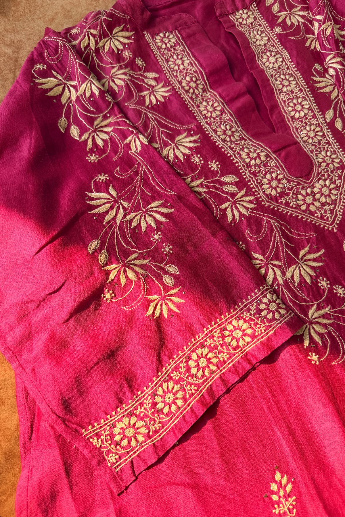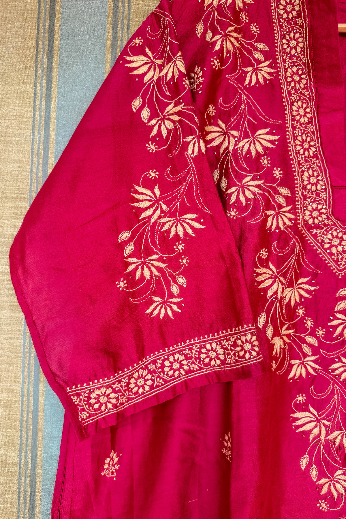 The kurti comes in Royal Pink colour with contrast fawn coloured thread embroidery on it.