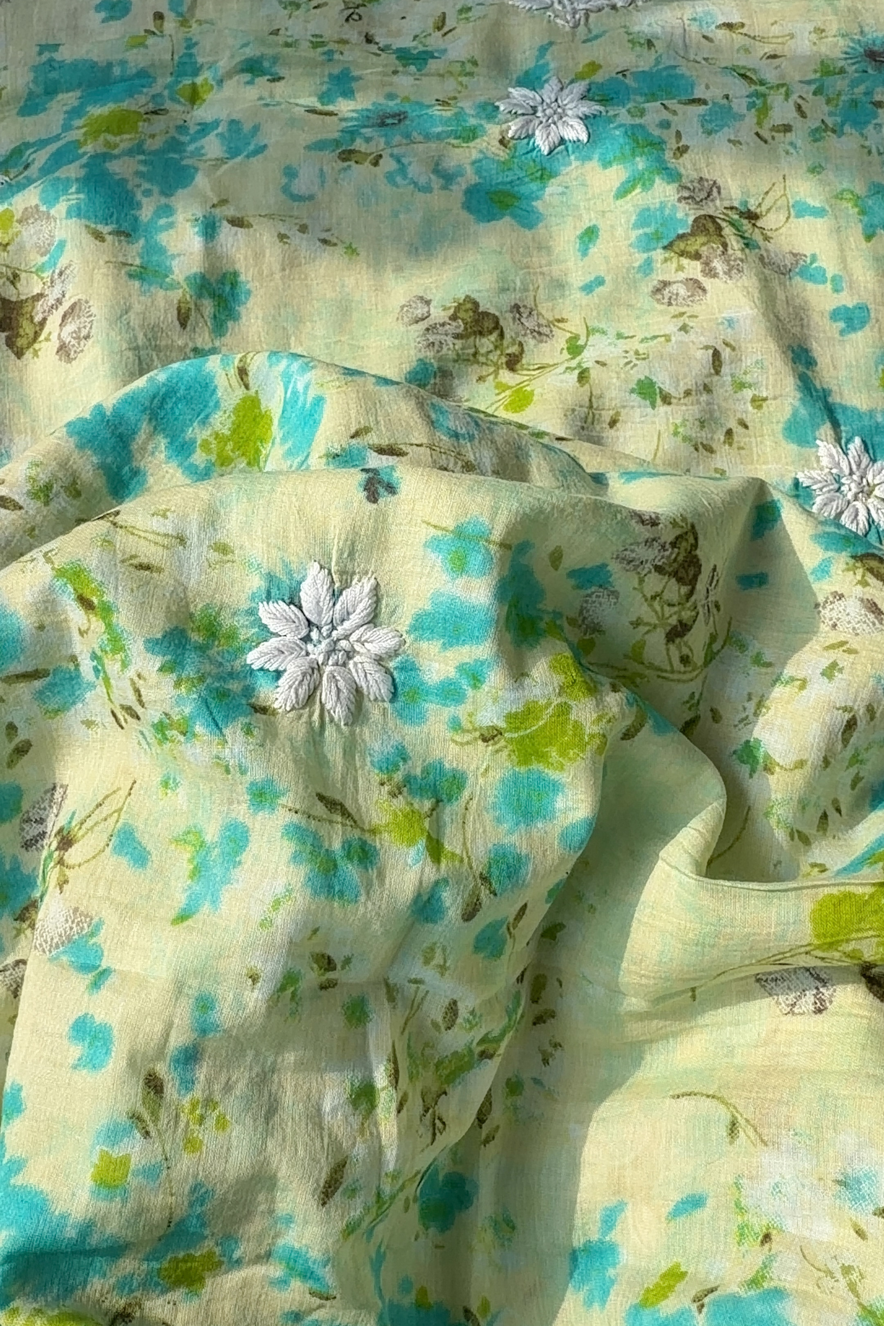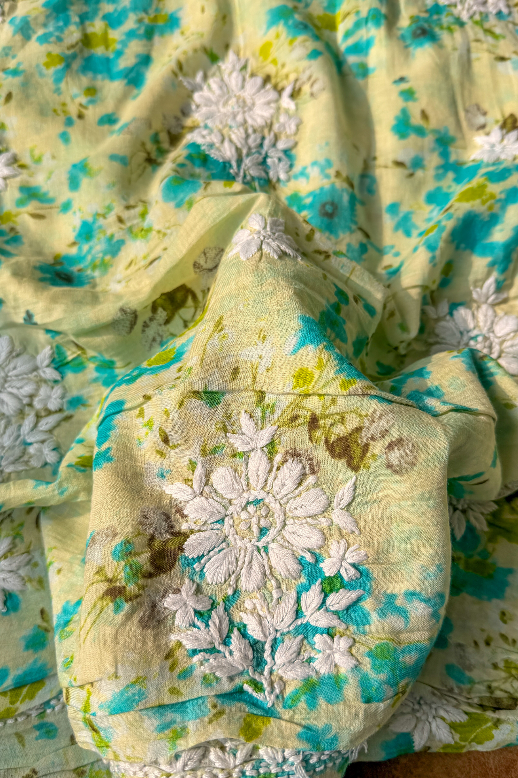 Crafted from premium pure mulmul with intricate printed patterns, this unstitched chikankari kurti set showcases masterful hand embroidery throughout. The neckline features elaborate detailing while the fabric is adorned with densely worked motifs across its expanse, exemplifying traditional artisanal craftsmanship. Includes coordinating dupatta to complete the ensemble.
