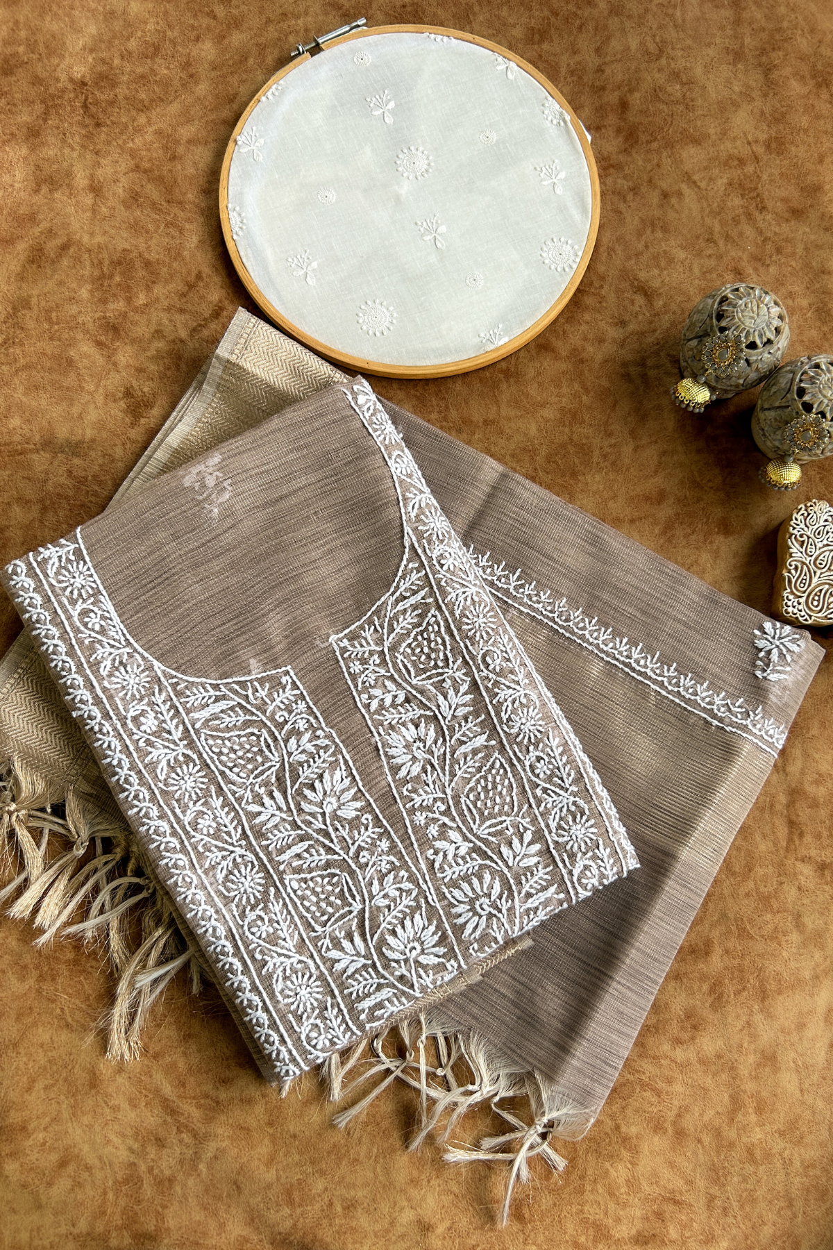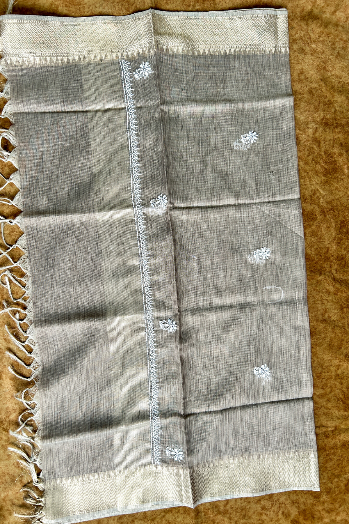 A beautiful hand embroidered Chikankari Suit with heavy Boota Booti design embroidery on it. The dupatta has Banarasi border in it and has Tissue fabric shine giving it a good Party Wear Look for this season.