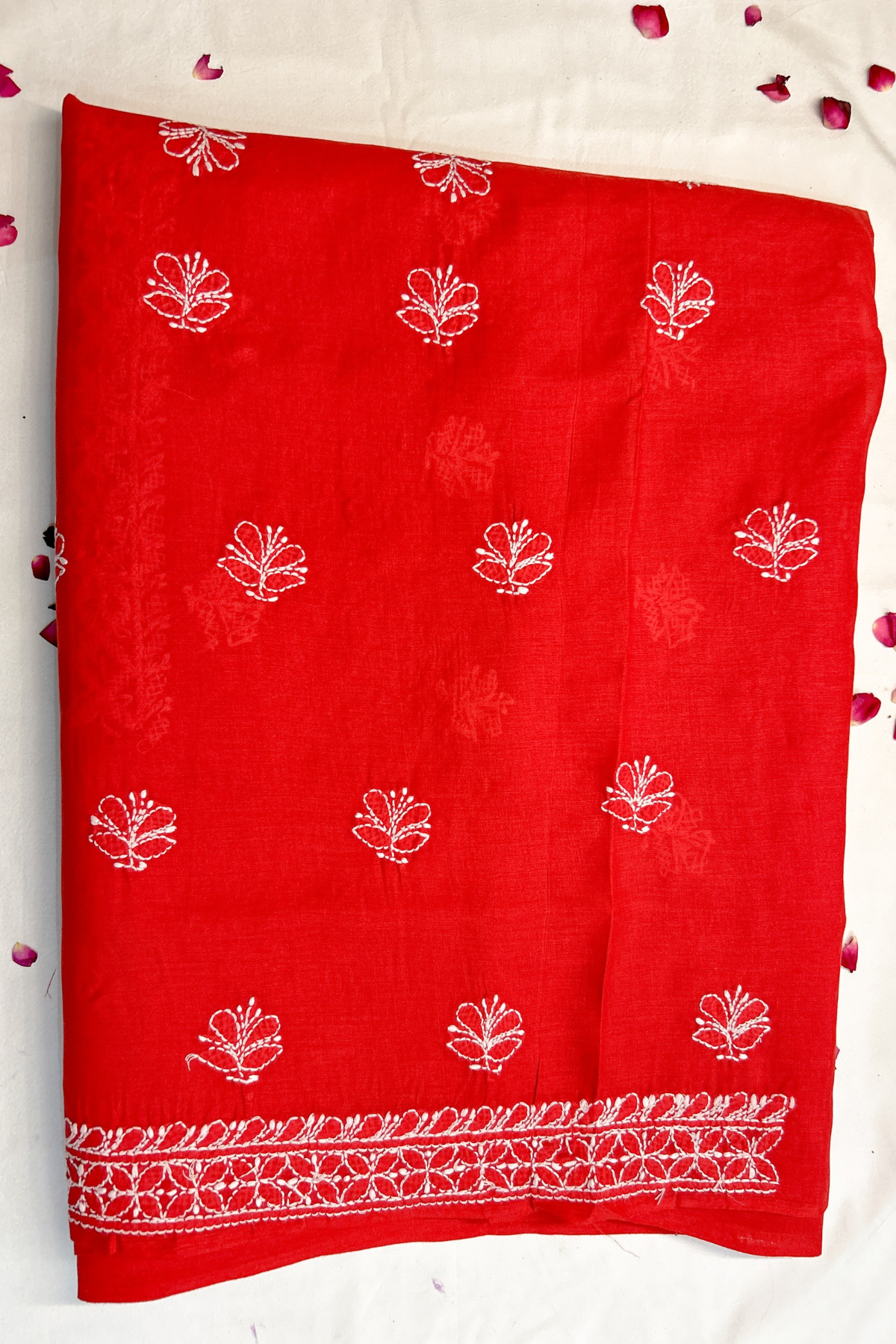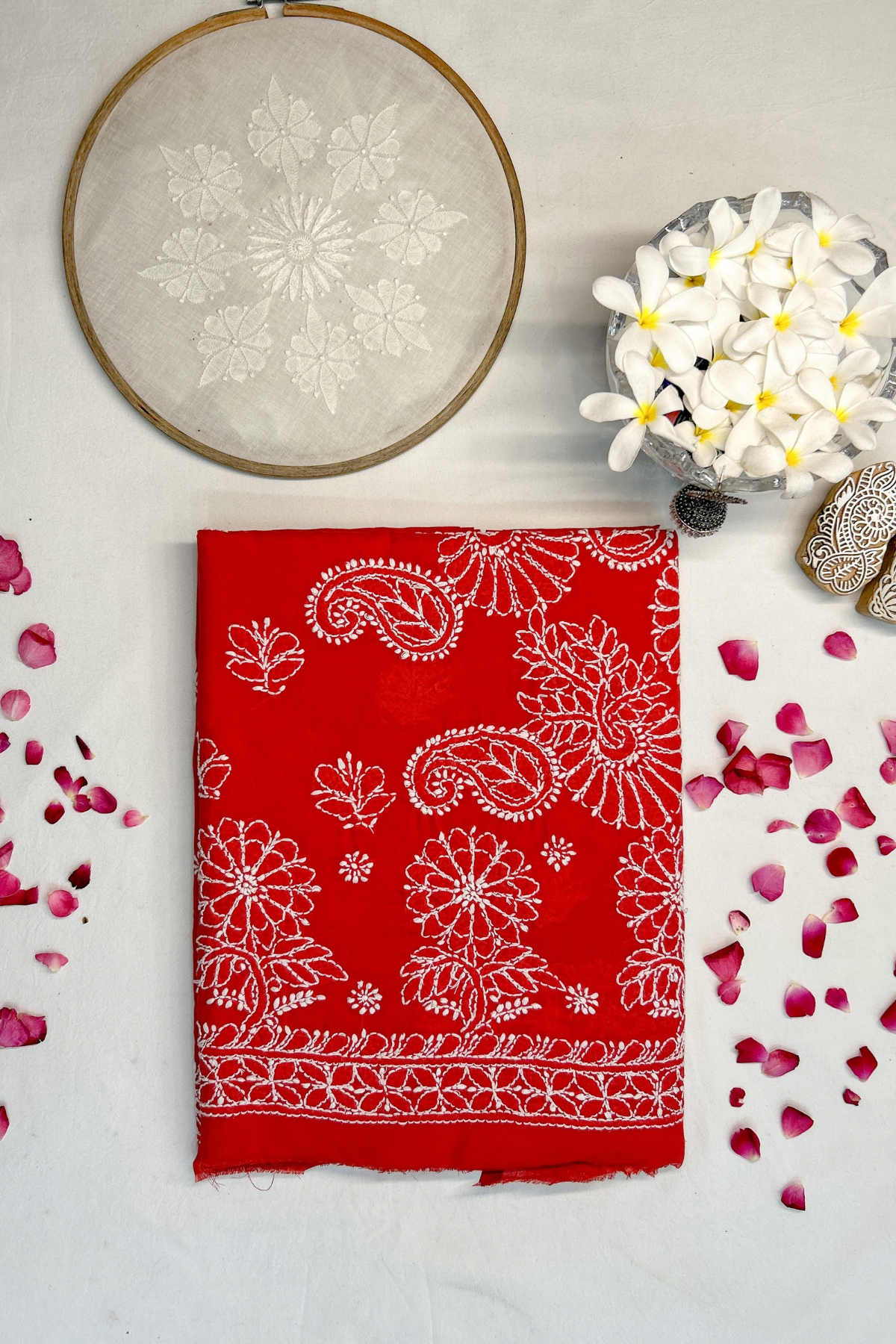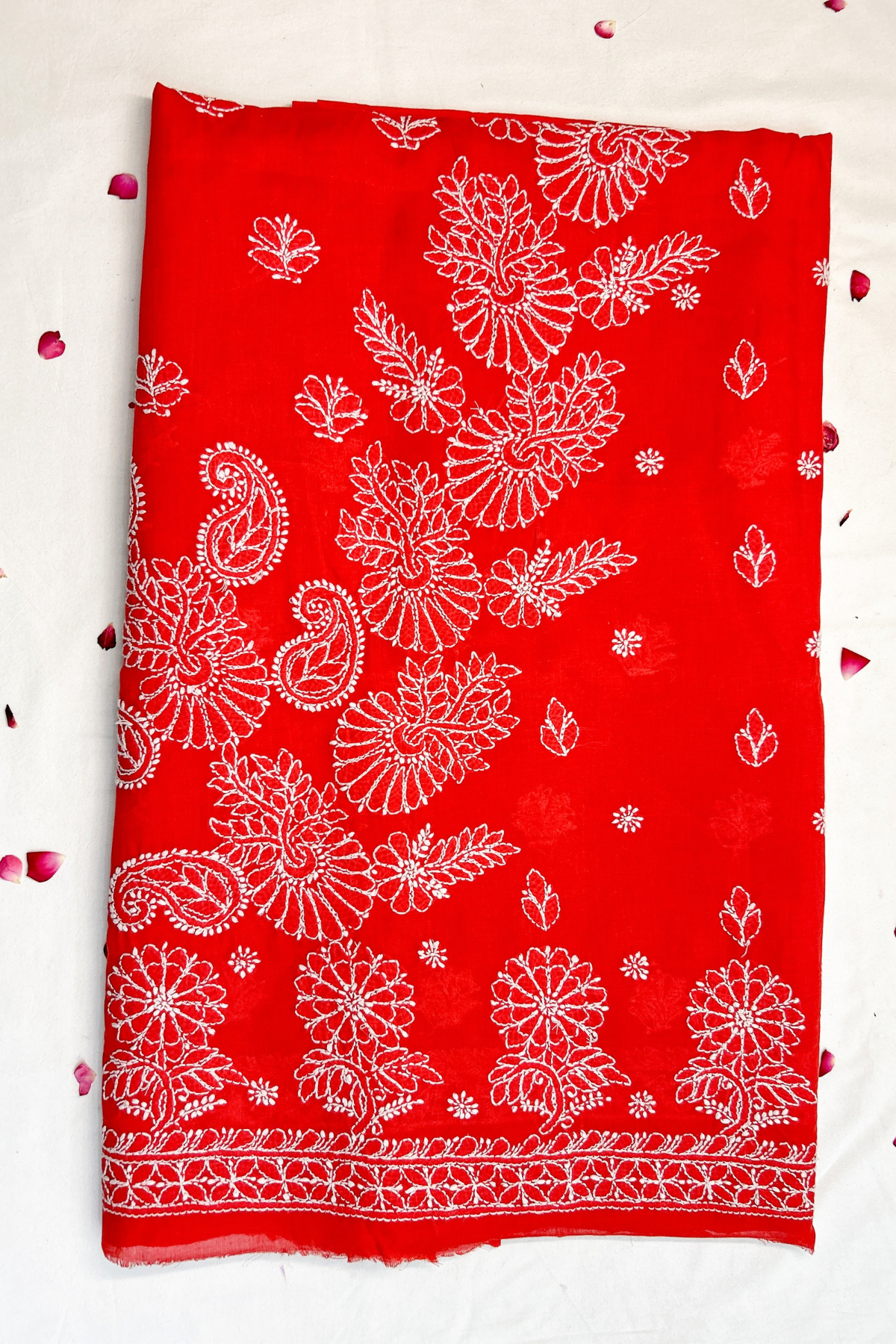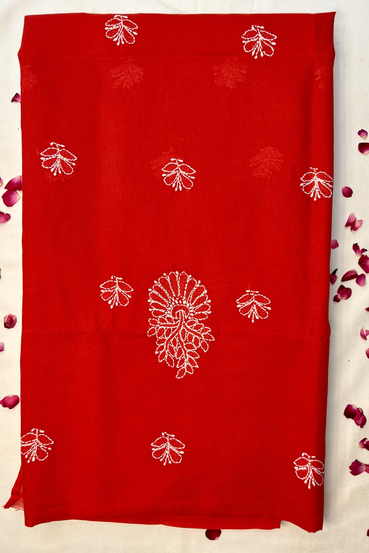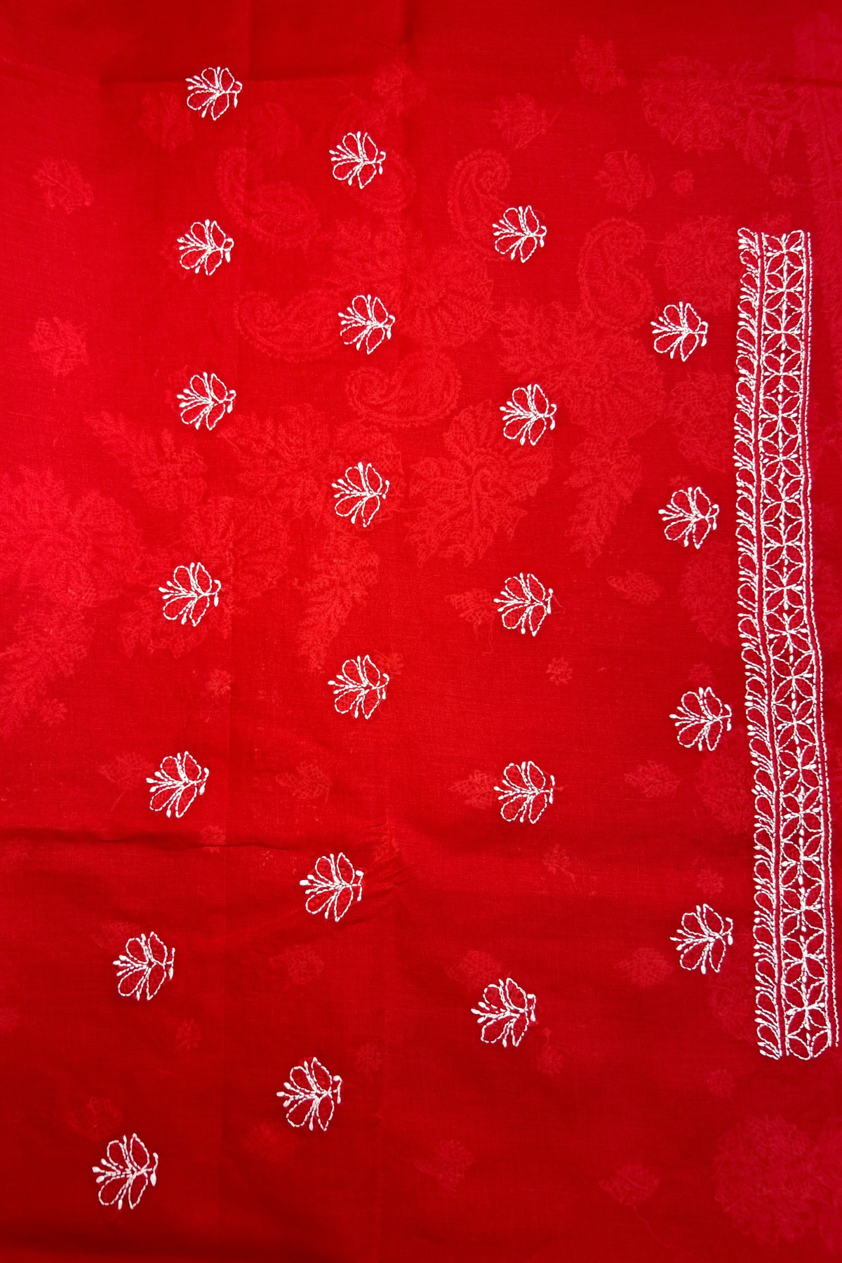 A beautiful hand embroidered Unstitched Chikankari Kurti, Bottom and Dupatta set. The Kurti and Bottom is of Pure Cotton fabric and Dupatta is of pure Chiffon with crochet border on it. The kurti has heavy Bel embroidered on it`s sleeves with all over bootis on it. The bottom has heavy Border with heavy bootis embroidered on it.