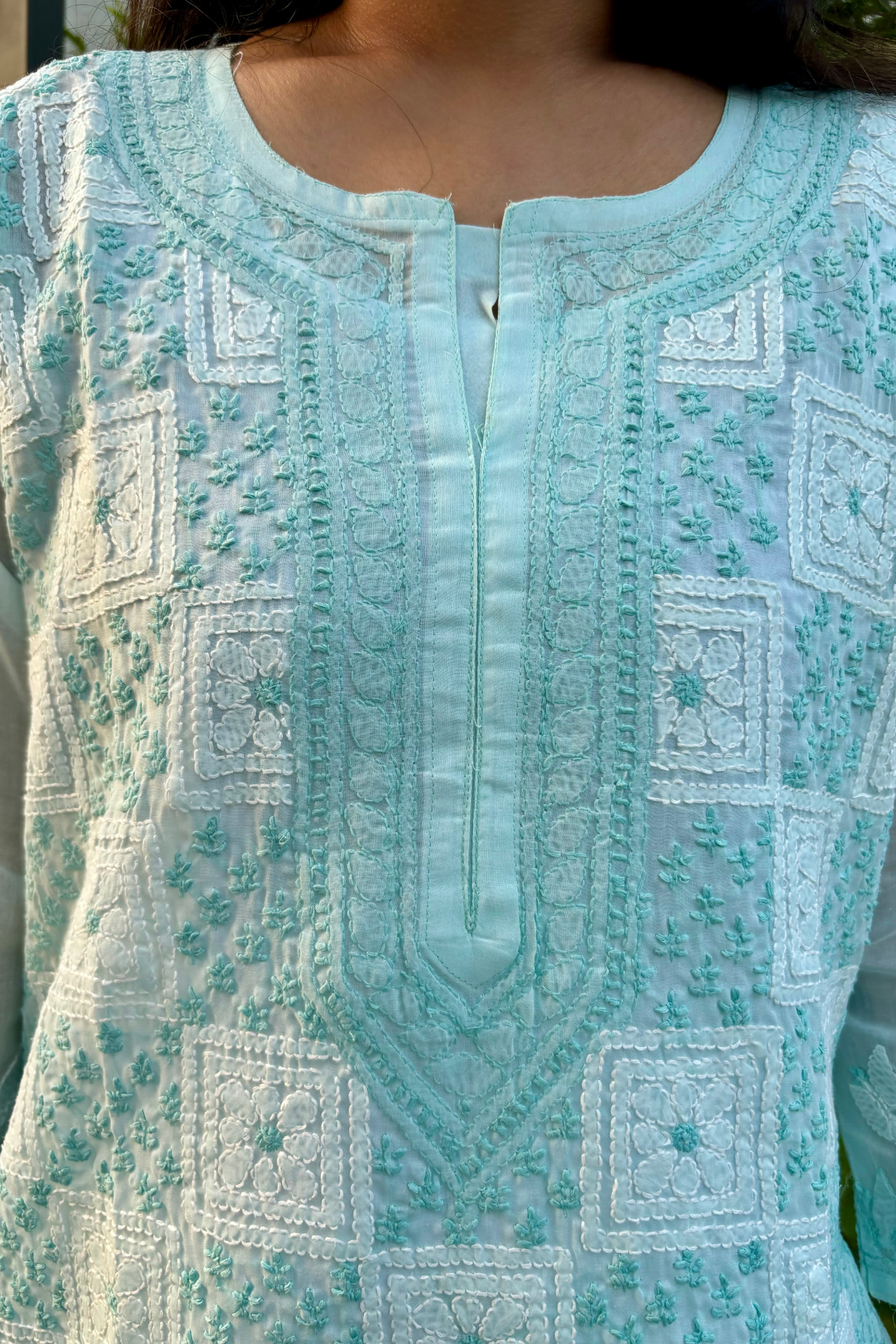 A beautiful hand embroidered chikan Kurti with all over front embroidery on it from same coloured thread. The kurti has fancy Square designed motifs with intricate embroidery detailing the kurti.