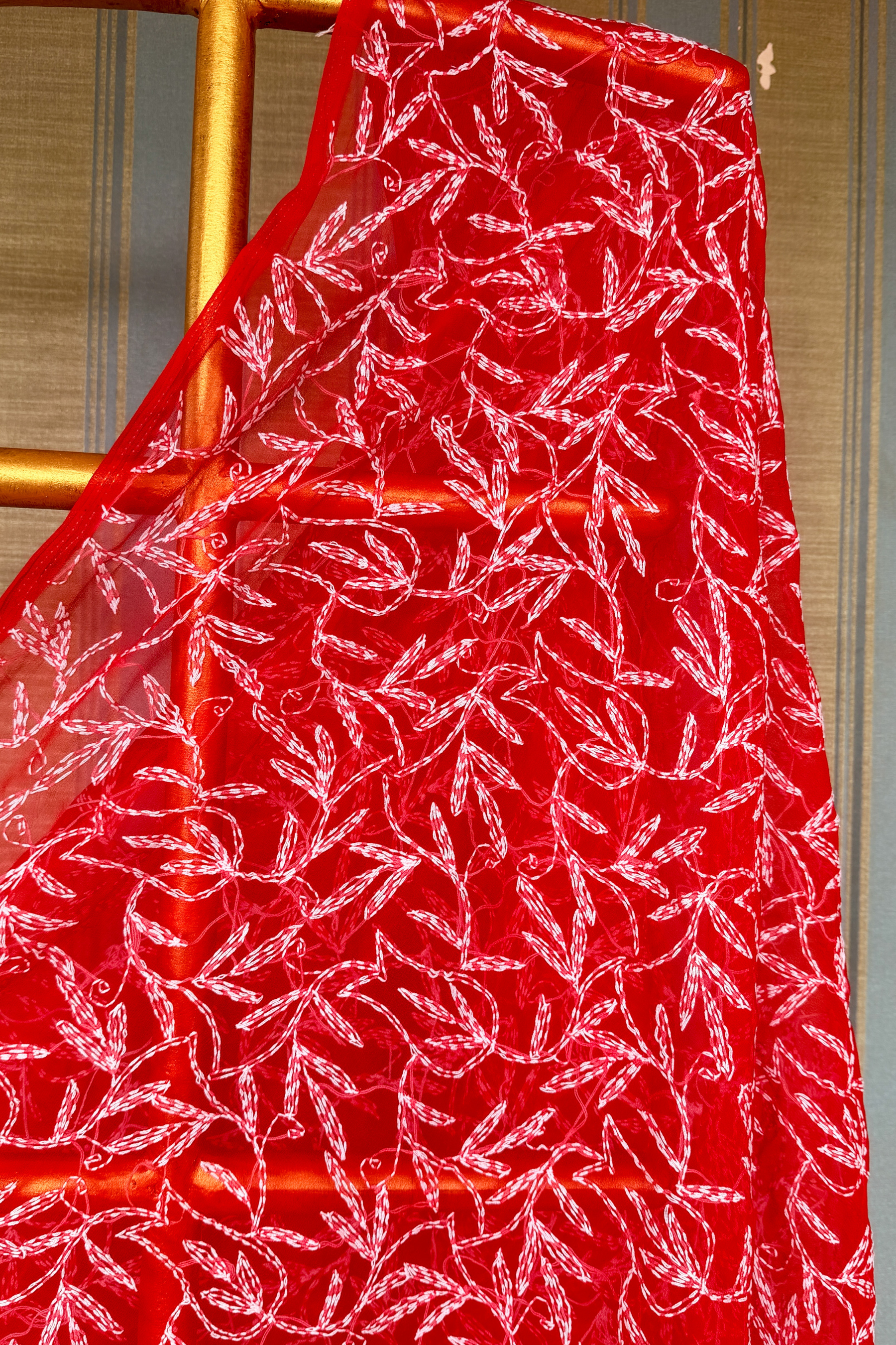Crafted from semi-georgette fabric, this striking Red dupatta showcases meticulous hand embroidery across its entire surface, enhanced by ornate borders framing both ends. The comprehensive embroidery work offers versatility—wear it traditionally as a dupatta, or repurpose the fabric to create a fully embellished kurti once its initial use concludes. A testament to artisanal skill and thoughtful design.