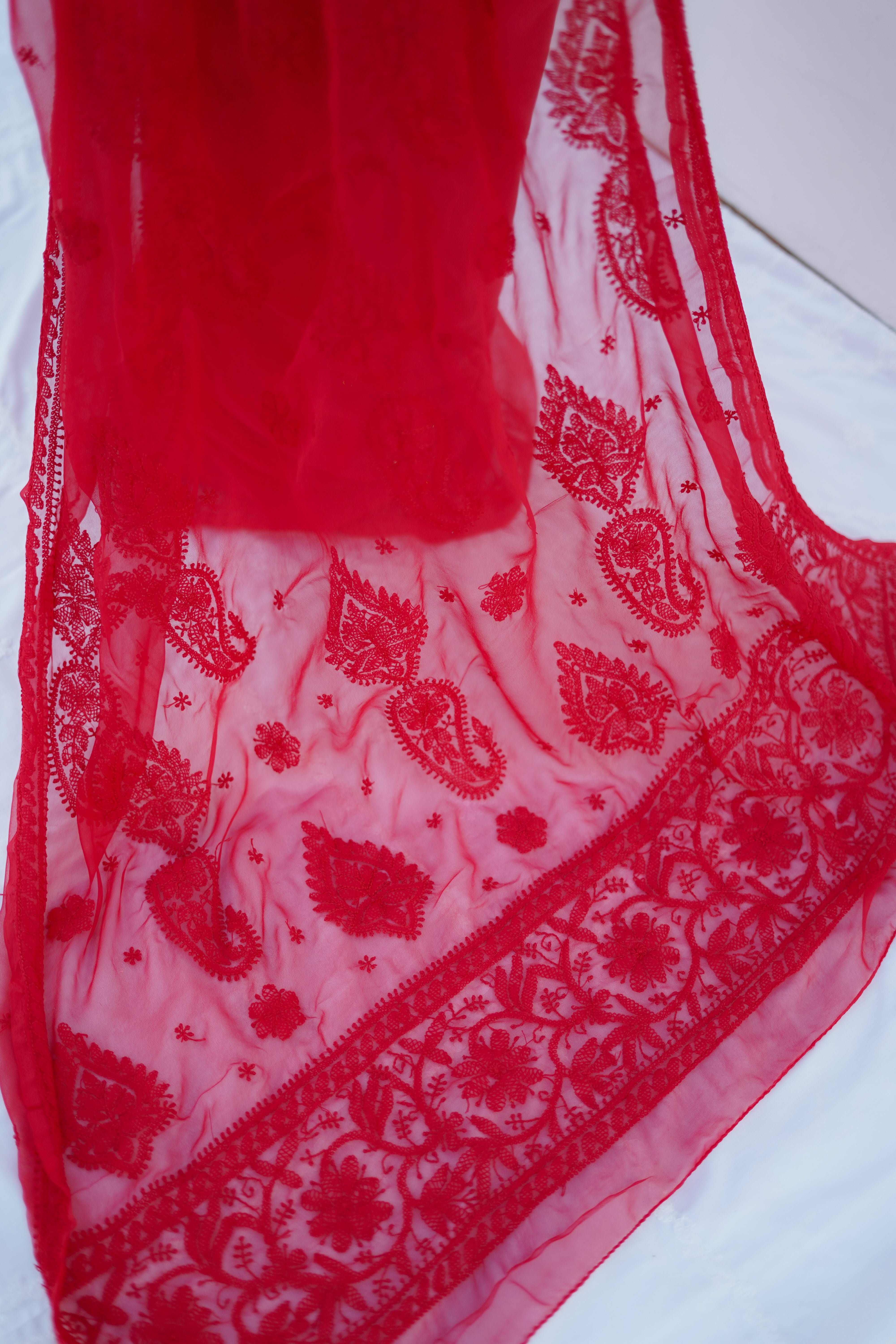 A beautiful hand embroidered Unstitched Chikankari Saree with heavy Palla having Boota Booti design embroidery on it. The saree comes in red colour with embroidery on it from same red thread.