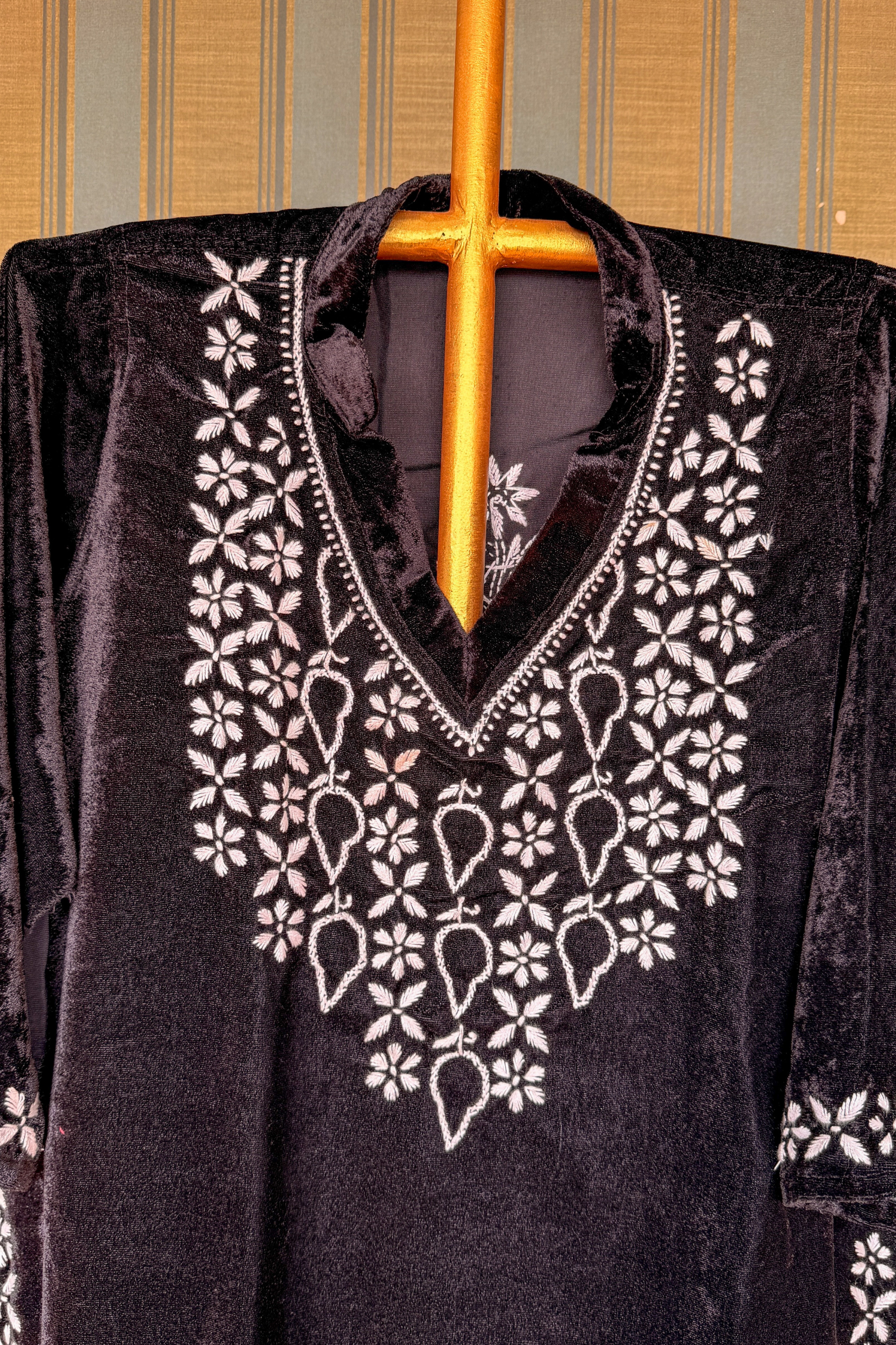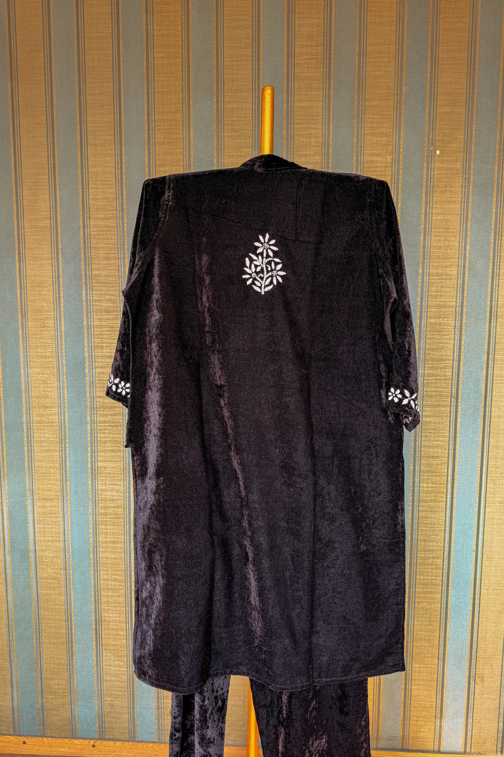 A refined hand-embroidered kurta and pant coord set crafted in luxurious velvet, featuring elegant white Chikankari embroidery that adds timeless sophistication. The kurti showcases intricate floral and paisley-inspired detailing on the neckline, sleeves, and side panels, creating a balanced yet statement look.