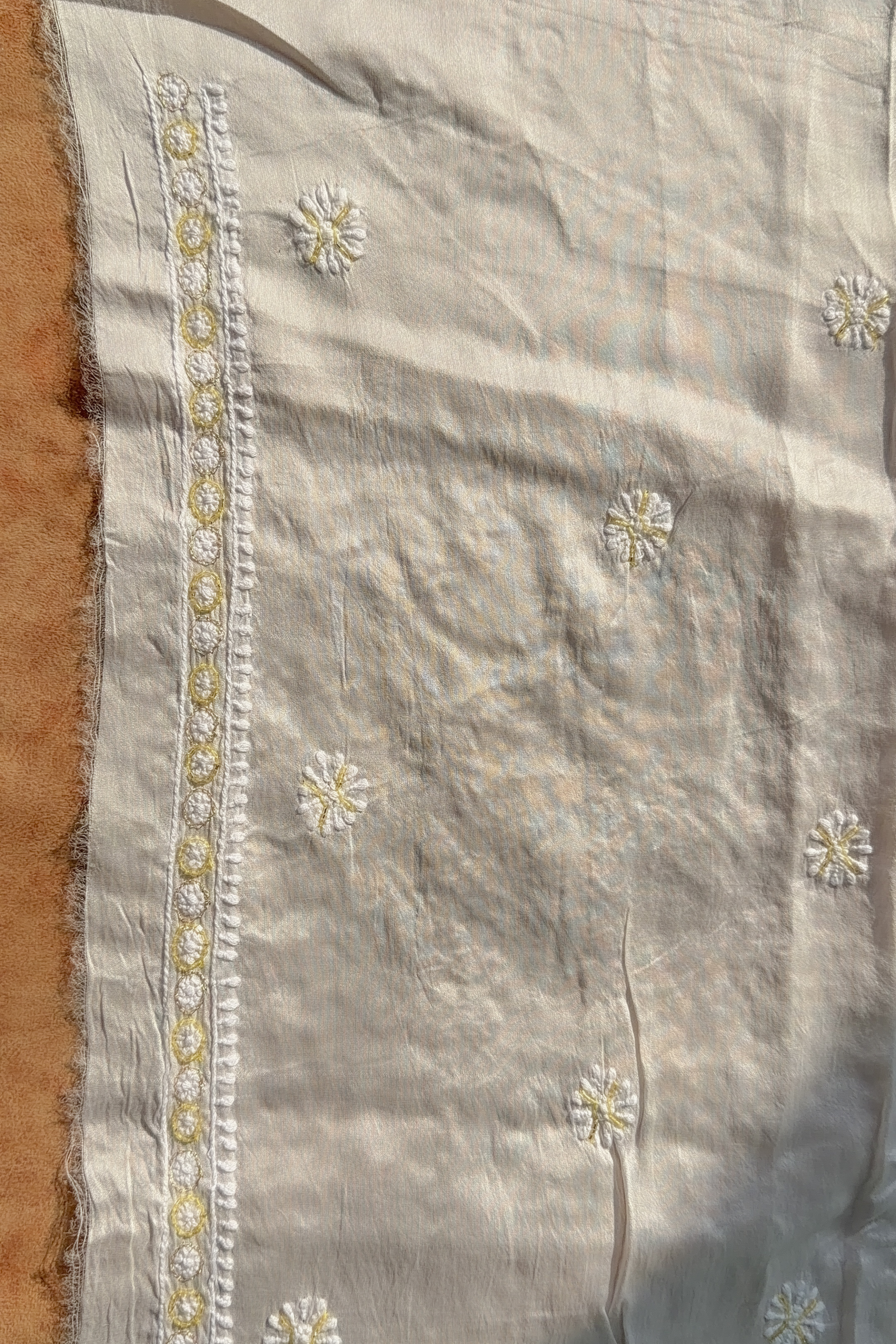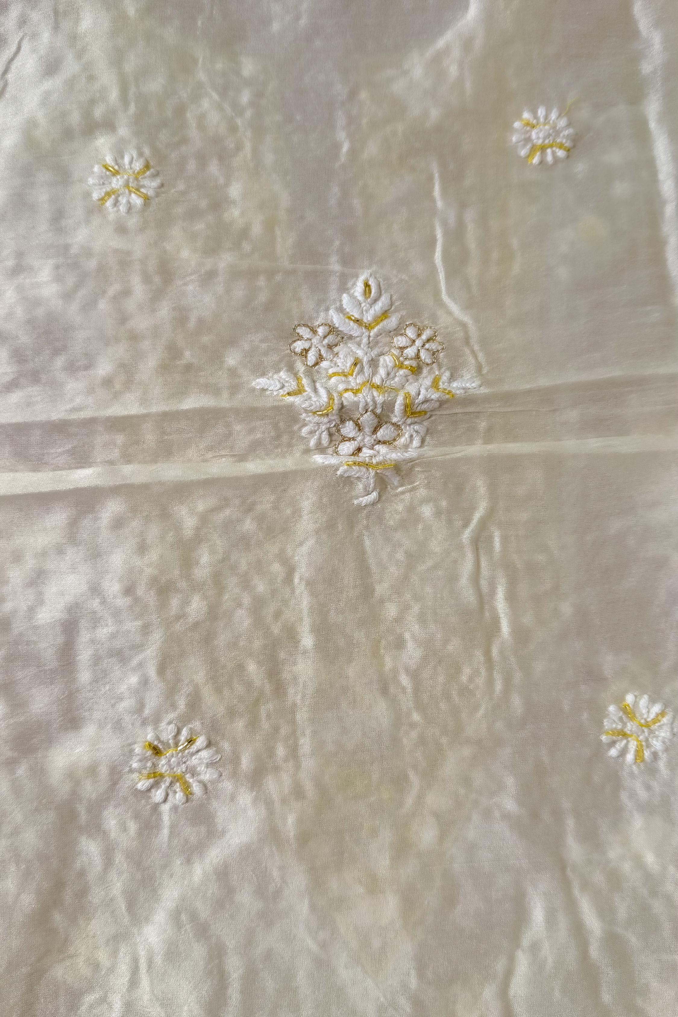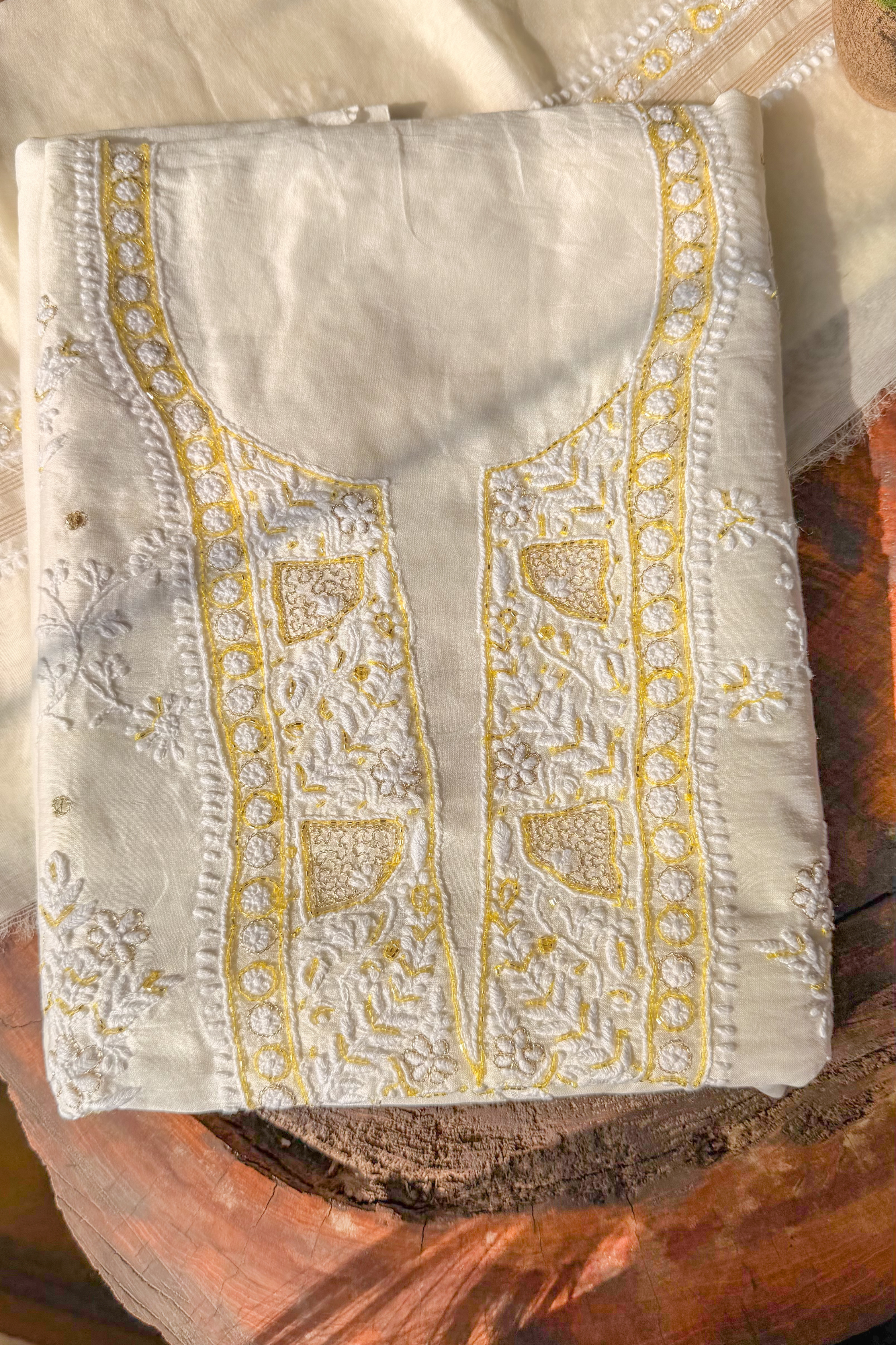This elegant unstitched set features a kurti and dupatta crafted from a Chanderi silk blend fabric, highlighted with fine hand embroidery. The ensemble showcases traditional Lucknowi Chikankari craftsmanship, accentuated with subtle Yellow embellishments detailing that enhances the richness of the ivory base.