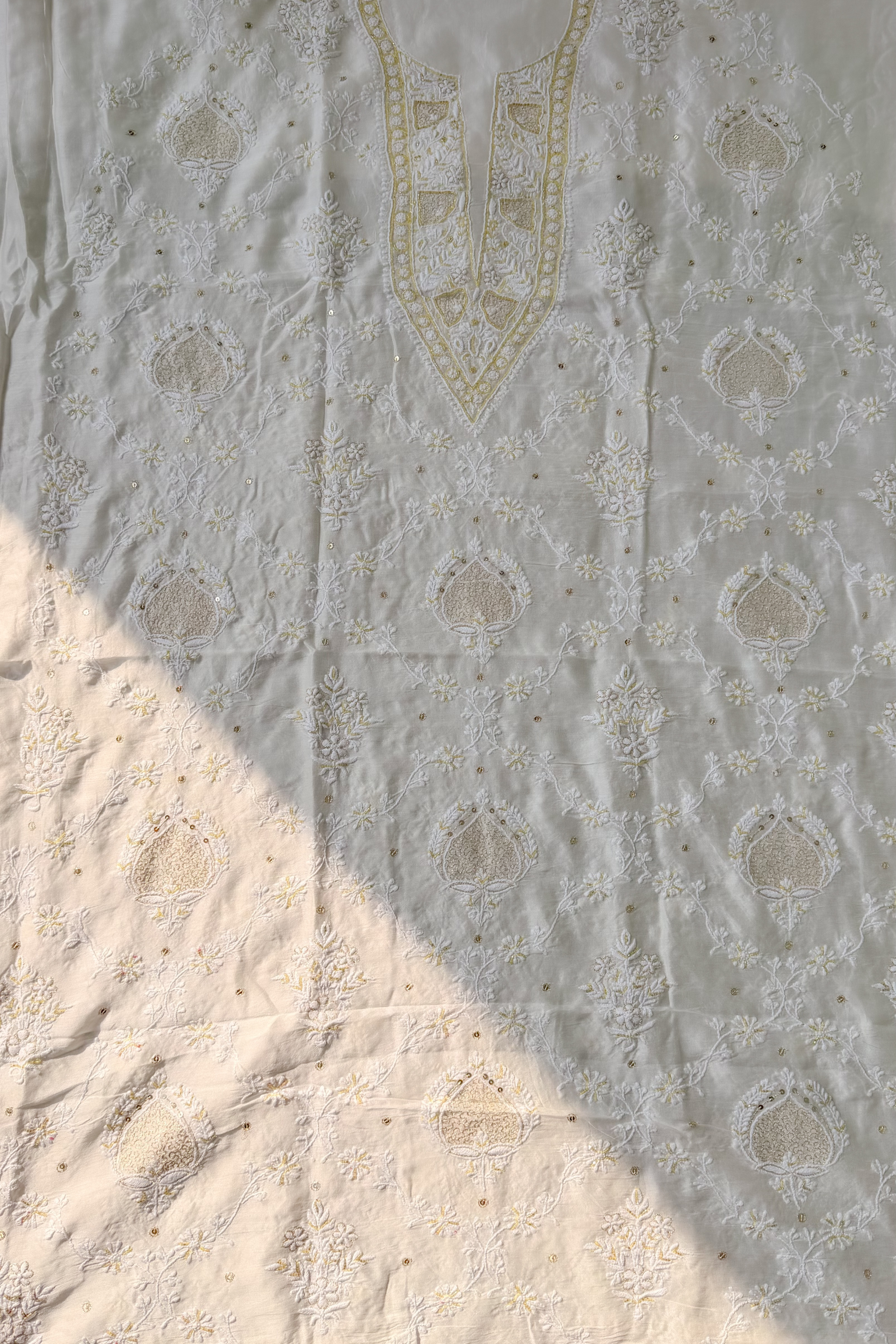 Work – The kurti features a heavily embroidered neckline with intricate chikankari has heavy front jaal embroidery on it enhanced with fine detailing and minimal embellishment, paired with a coordinated dupatta carrying scattered chikankari motifs.