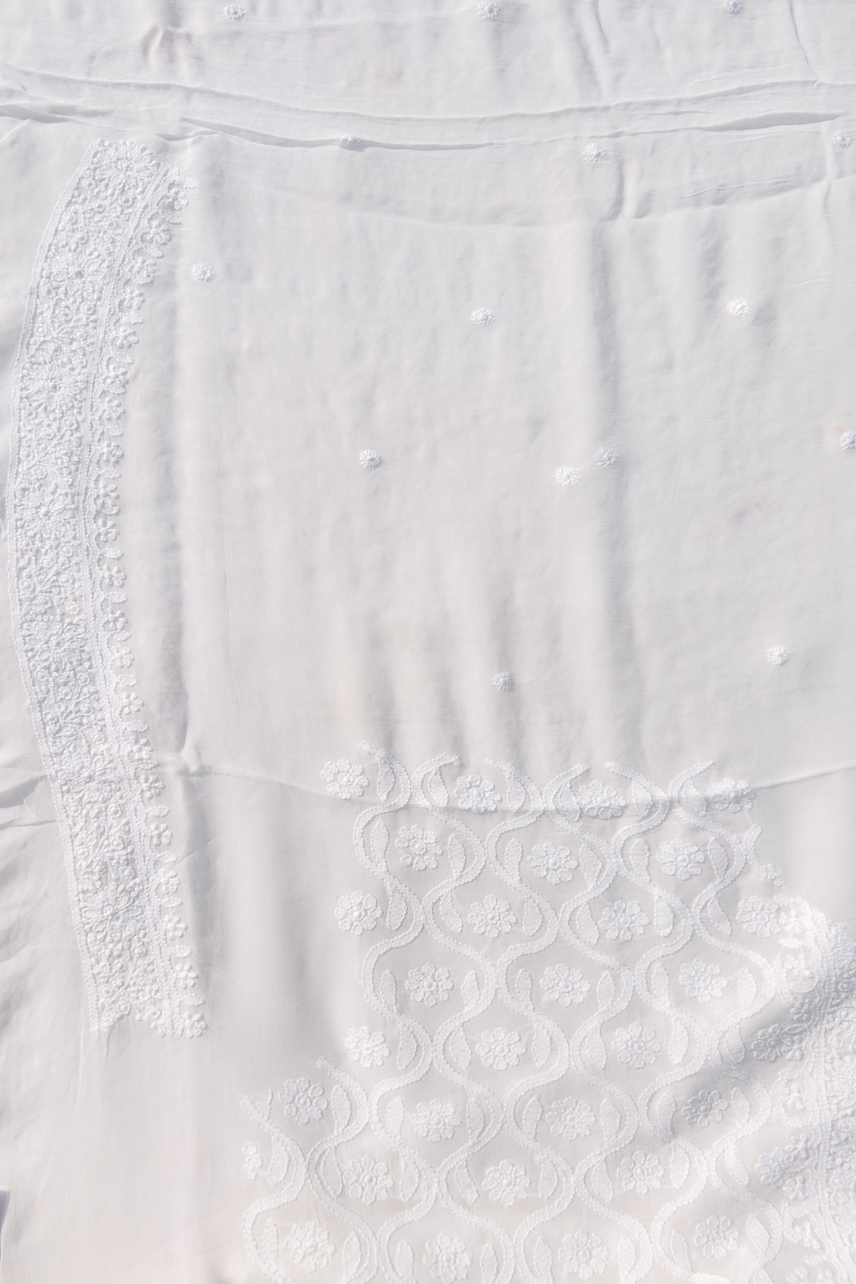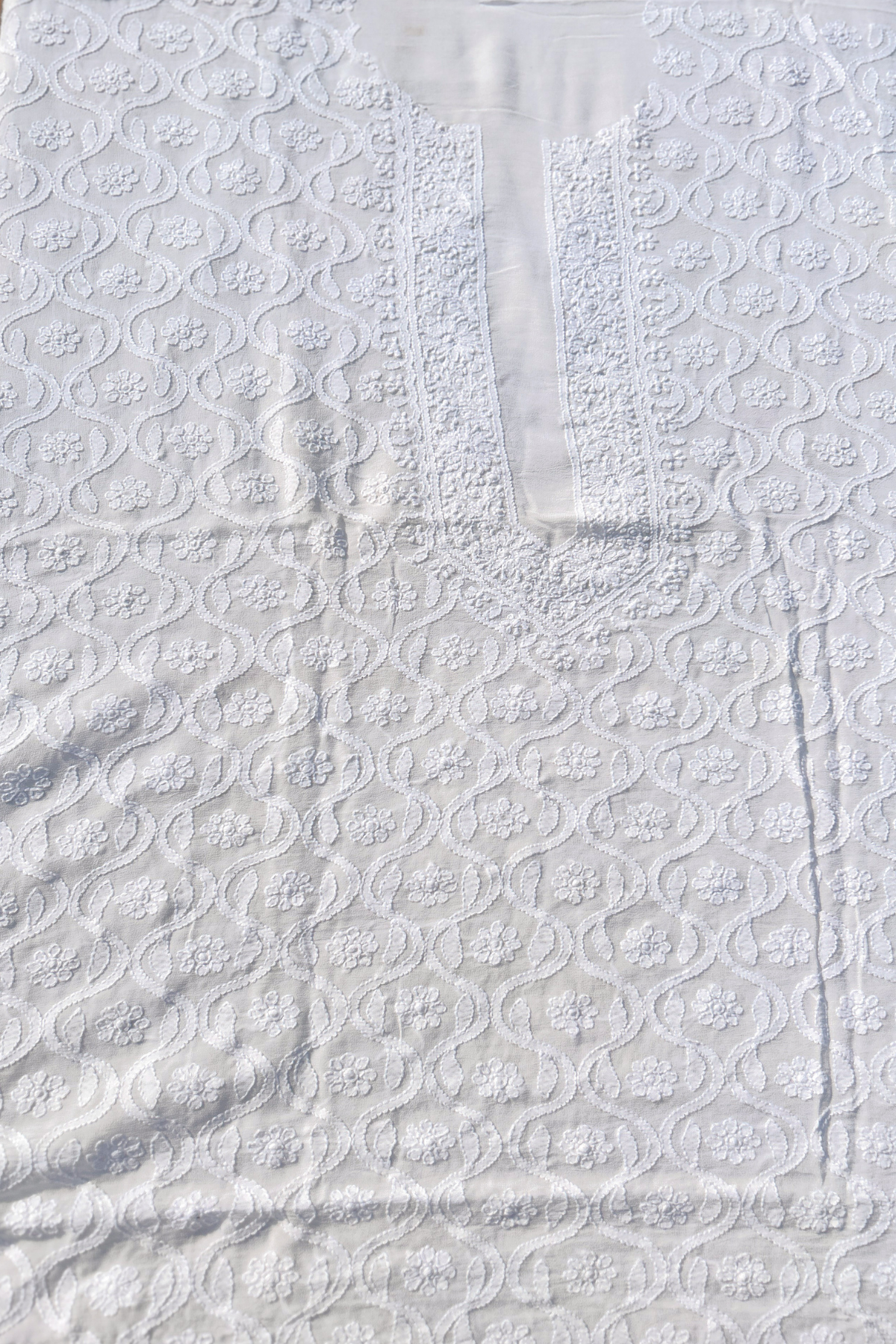 A beautiful Men's Kurta piece with all over hand embroidery on it with Bakhiya, Phanda and Pakki Keel stitches of Chikankari. The kurta piece comes in Pure Viscose Georgette fabric so has a very pretty fall to it. The kurta can also be dyed into any colour.