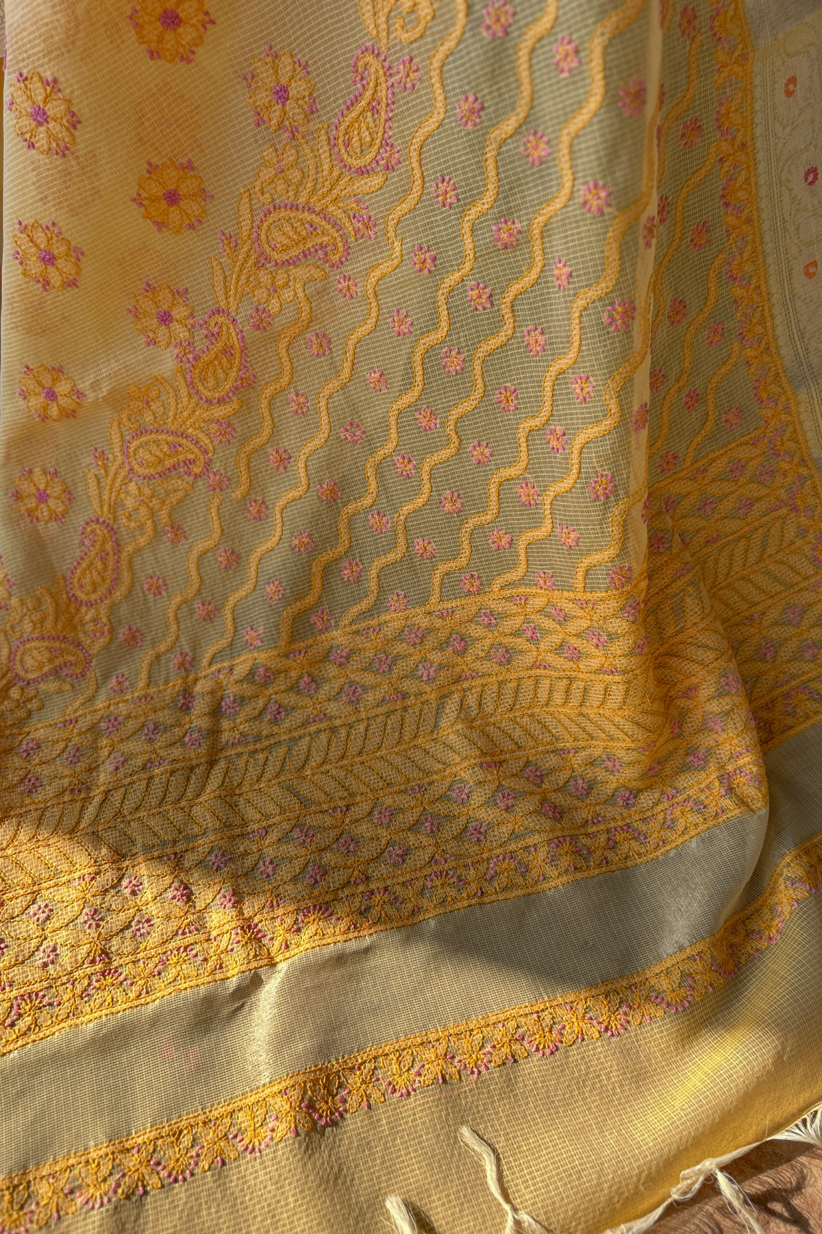 A beautiful hand embroidered Chikankari Saree with heavy Palla with heavy Booti design embroidery on it. The saree comes with embroidery on it from same coloured thread as of the base with an exquisite detailing from a contrast thread.