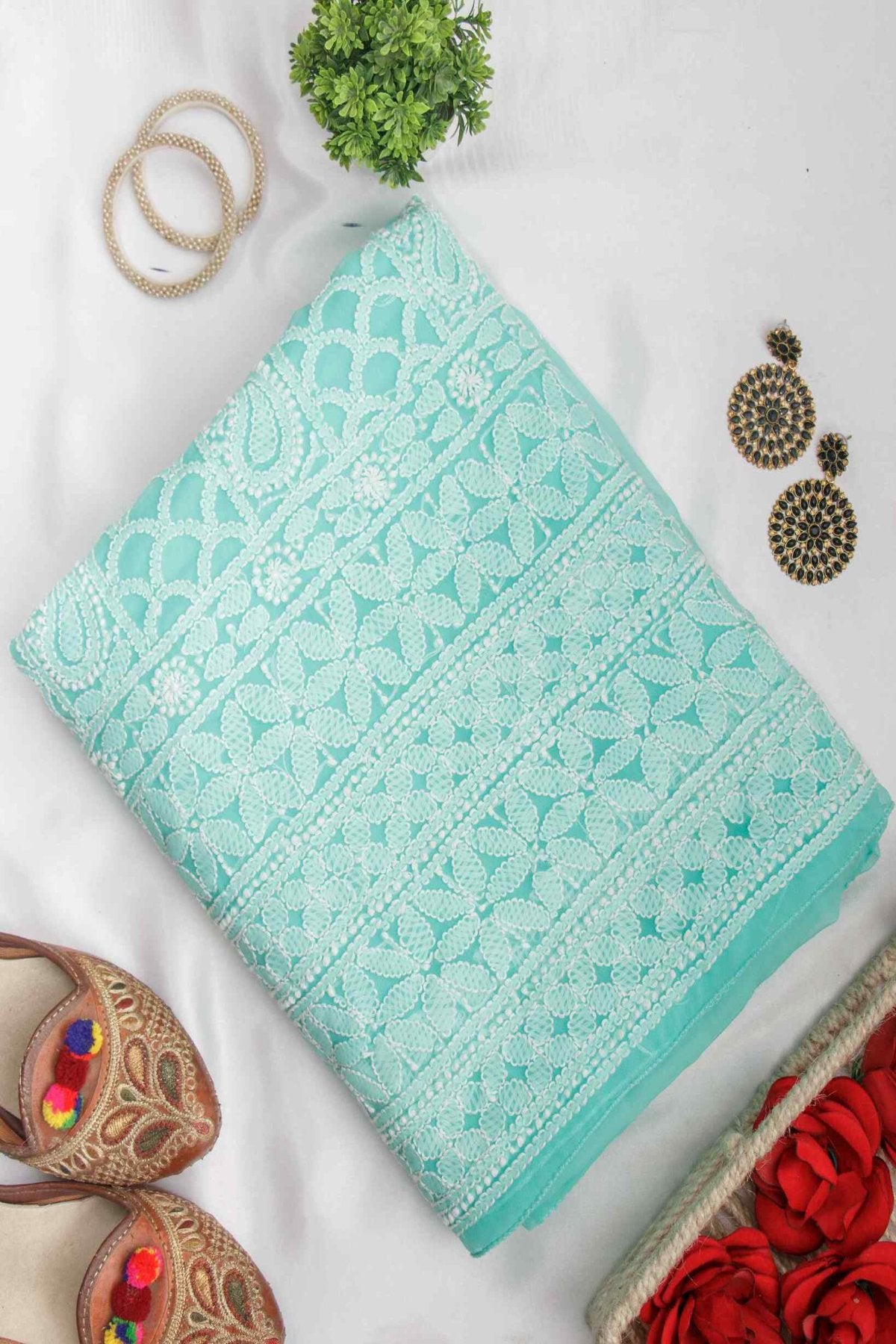A beautiful hand embroidered Unstitched Chikankari Kurti, Bottom and Dupatta set. Thes set comes in Semi Georgette fabric. The kurti has heavy Bel embroidered on it`s sleeves with all over bootis on it. The bottom has heavy Border with heavy bootis embroidered on it.